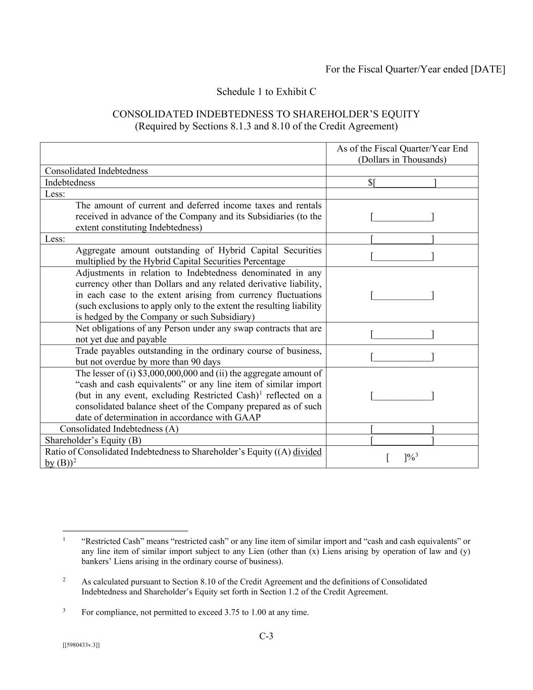 C-3 [[5980433v.3]] For the Fiscal Quarter/Year ended [DATE] Schedule 1 to Exhibit C CONSOLIDATED INDEBTEDNESS TO SHAREHOLDER’S EQUITY (Required by Sections 8.1.3 and 8.10 of the Credit Agreement) As of the Fiscal Quarter/Year End (Dollars in Thousands) Consolidated Indebtedness Indebtedness $[____________] Less: The amount of current and deferred income taxes and rentals received in advance of the Company and its Subsidiaries (to the extent constituting Indebtedness) [____________] Less: [____________] Aggregate amount outstanding of Hybrid Capital Securities multiplied by the Hybrid Capital Securities Percentage [____________] Adjustments in relation to Indebtedness denominated in any currency other than Dollars and any related derivative liability, in each case to the extent arising from currency fluctuations (such exclusions to apply only to the extent the resulting liability is hedged by the Company or such Subsidiary) [____________] Net obligations of any Person under any swap contracts that are not yet due and payable [____________] Trade payables outstanding in the ordinary course of business, but not overdue by more than 90 days [____________] The lesser of (i) $3,000,000,000 and (ii) the aggregate amount of “cash and cash equivalents” or any line item of similar import (but in any event, excluding Restricted Cash)1 reflected on a consolidated balance sheet of the Company prepared as of such date of determination in accordance with GAAP [____________] Consolidated Indebtedness (A) [____________] Shareholder’s Equity (B) [____________] Ratio of Consolidated Indebtedness to Shareholder’s Equity ((A) divided by (B))2 [ ]%3 1 “Restricted Cash” means “restricted cash” or any line item of similar import and “cash and cash equivalents” or any line item of similar import subject to any Lien (other than (x) Liens arising by operation of law and (y) bankers’ Liens arising in the ordinary course of business). 2 As calculated pursuant to Section 8.10 of the Credit Agreement and the definitions of Consolidated Indebtedness and Shareholder’s Equity set forth in Section 1.2 of the Credit Agreement. 3 For compliance, not permitted to exceed 3.75 to 1.00 at any time.