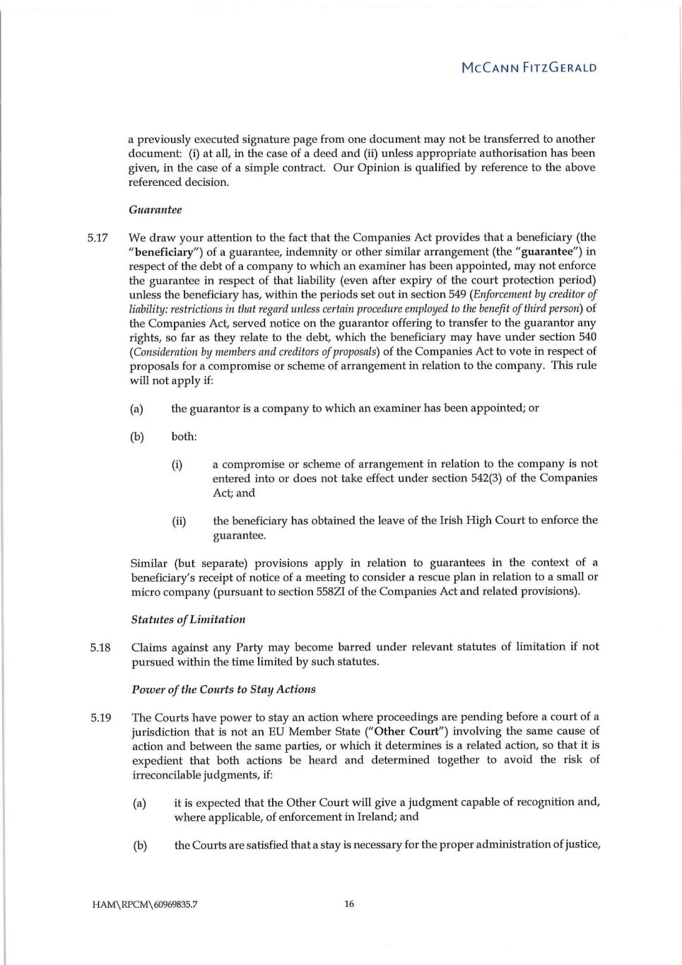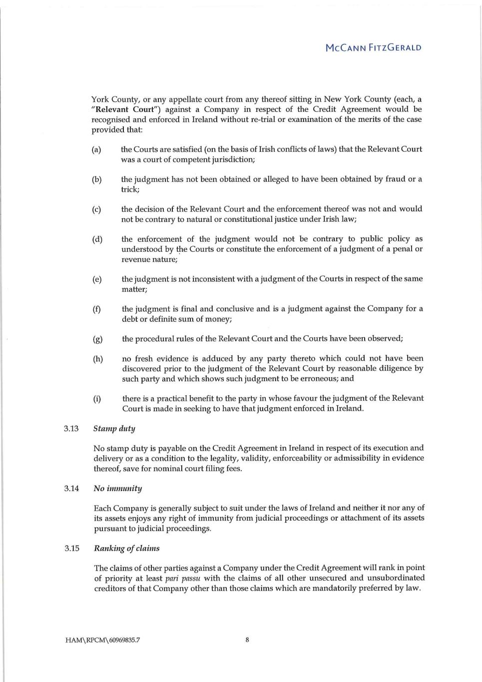 4 [[5988199]] regulations, (iv) Section 12.8 of the Credit Agreement or any similar provision of any other Loan Document (or the effect on any other provision in the Credit Agreement or any other Loan Document in which the terms defined in such Section or any such similar provision are used) or (v) the effect of any provision of the Credit Agreement which is intended to permit modification thereof only by means of an agreement in writing signed by the parties thereto. We note that certain of the Specified Agreements are governed by laws other than those of the State of New York; our opinions expressed herein are based solely upon our understanding of the plain language of such agreements, and we do not assume any responsibility with respect to the effect on the opinions or statements set forth herein of any interpretation thereof inconsistent with such understanding. We understand that you are satisfying yourselves as to the status under Section 548 of Title 11 of the United States Code and applicable state fraudulent conveyance laws of the obligations of each Loan Party under the Loan Documents, and we express no opinion thereon. We are admitted to practice only in the State of New York, and we express no opinion as to matters governed by any laws other than the laws of the State of New York and the Federal laws of the United States of America. In particular, we do not purport to pass on any matter governed by the laws of the Netherlands or Ireland.