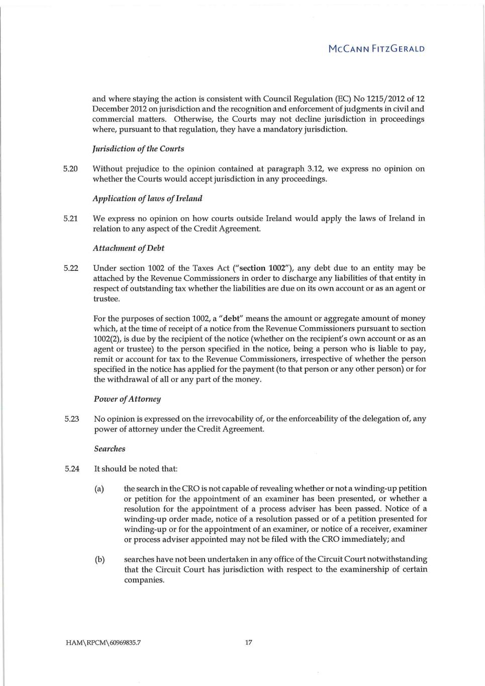 12 53103665 M 52055368 / 5 However, the Netherlands have ratified the Hague Convention on the Law Applicable to Trusts and their Recognition of 1985 (the "Hague Trust Convention") and consequently, if a trust purported to be created under the Credit Agreement has the characteristics of a trust under the Hague Trust Convention, the recognition of that trust by the courts of the Netherlands will be subject to the requirements and limitations of the Hague Trust Convention. P. We have taken note of the judgments of the French Cour de Cassation, in which it ruled that a one-sided jurisdiction clause (i.e. a jurisdiction clause that is exclusive for one party only whereas the other has the right to bring action in different jurisdiction) may be invalid on the basis that it breaches article 23 of the Enforcement Regulation respectively article 23 of the Lugano II Convention. The consequences of these judgments on the validity of one-sided exclusive jurisdiction clauses under the Recast Enforcement Regulation in the Netherlands and Europe are unclear. Q. The opinion expressed in paragraph 14 (No Stamp Duties) does not purport to express any opinion on Dutch real estate transfer tax (overdrachtsbelasting) or on Dutch insurance premium tax (assurantiebelasting). R. With respect to the opinion expressed in paragraph 15 (No Withholding Tax), please note that payments of interest (including deemed payments of interest) made by or on behalf of the on Dutch Company to a Related Entity may become subject to on Dutch withholding tax if such Related Entity: (i) is considered to be resident (gevestigd) in a jurisdiction that is listed in the yearly updated on Dutch Regulation on low-taxing states and non-cooperative jurisdictions for tax purposes (Regeling laagbelastende staten en niet-coöperatieve rechtsgebieden voor belastingdoeleinden); or (ii) has a permanent establishment located in any such jurisdiction to which the interest payment is attributable; or (iii) is entitled to the interest payment with the main purpose or one of the main purposes of avoiding taxation for another person or entity and there is an artificial arrangement or transaction or a series of artificial arrangements or transactions; or (iv) is not considered to be the recipient of the interest payment in its jurisdiction of residence because such jurisdiction treats another