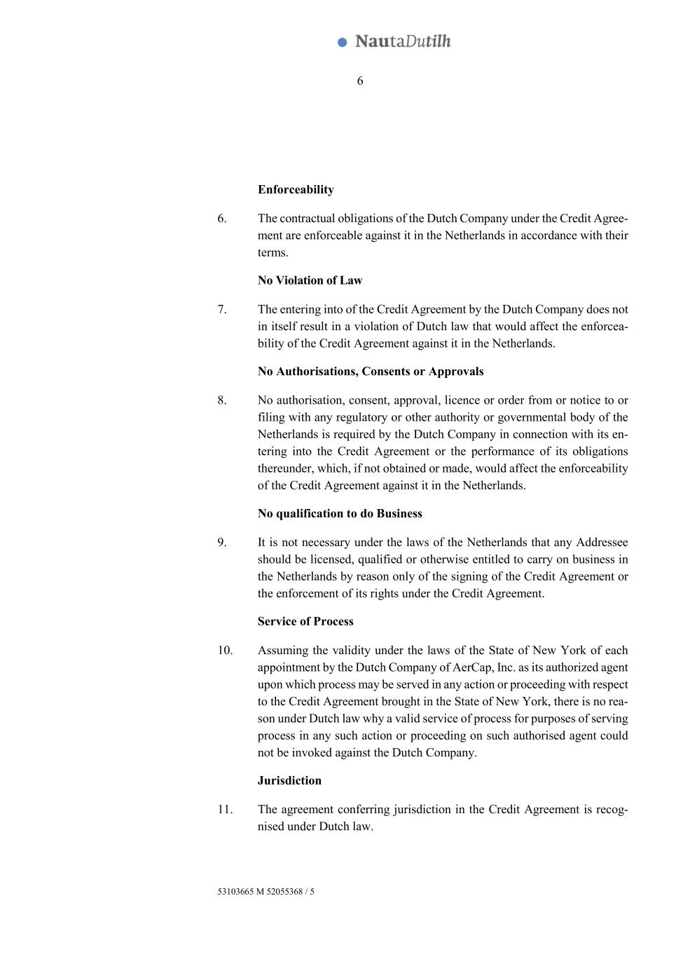 6 53103665 M 52055368 / 5 Enforceability 6. The contractual obligations of the Dutch Company under the Credit Agree- ment are enforceable against it in the Netherlands in accordance with their terms. No Violation of Law 7. The entering into of the Credit Agreement by the Dutch Company does not in itself result in a violation of Dutch law that would affect the enforcea- bility of the Credit Agreement against it in the Netherlands. No Authorisations, Consents or Approvals 8. No authorisation, consent, approval, licence or order from or notice to or filing with any regulatory or other authority or governmental body of the Netherlands is required by the Dutch Company in connection with its en- tering into the Credit Agreement or the performance of its obligations thereunder, which, if not obtained or made, would affect the enforceability of the Credit Agreement against it in the Netherlands. No qualification to do Business 9. It is not necessary under the laws of the Netherlands that any Addressee should be licensed, qualified or otherwise entitled to carry on business in the Netherlands by reason only of the signing of the Credit Agreement or the enforcement of its rights under the Credit Agreement. Service of Process 10. Assuming the validity under the laws of the State of New York of each appointment by the Dutch Company of AerCap, Inc. as its authorized agent upon which process may be served in any action or proceeding with respect to the Credit Agreement brought in the State of New York, there is no rea- son under Dutch law why a valid service of process for purposes of serving process in any such action or proceeding on such authorised agent could not be invoked against the Dutch Company. Jurisdiction 11. The agreement conferring jurisdiction in the Credit Agreement is recog- nised under Dutch law.