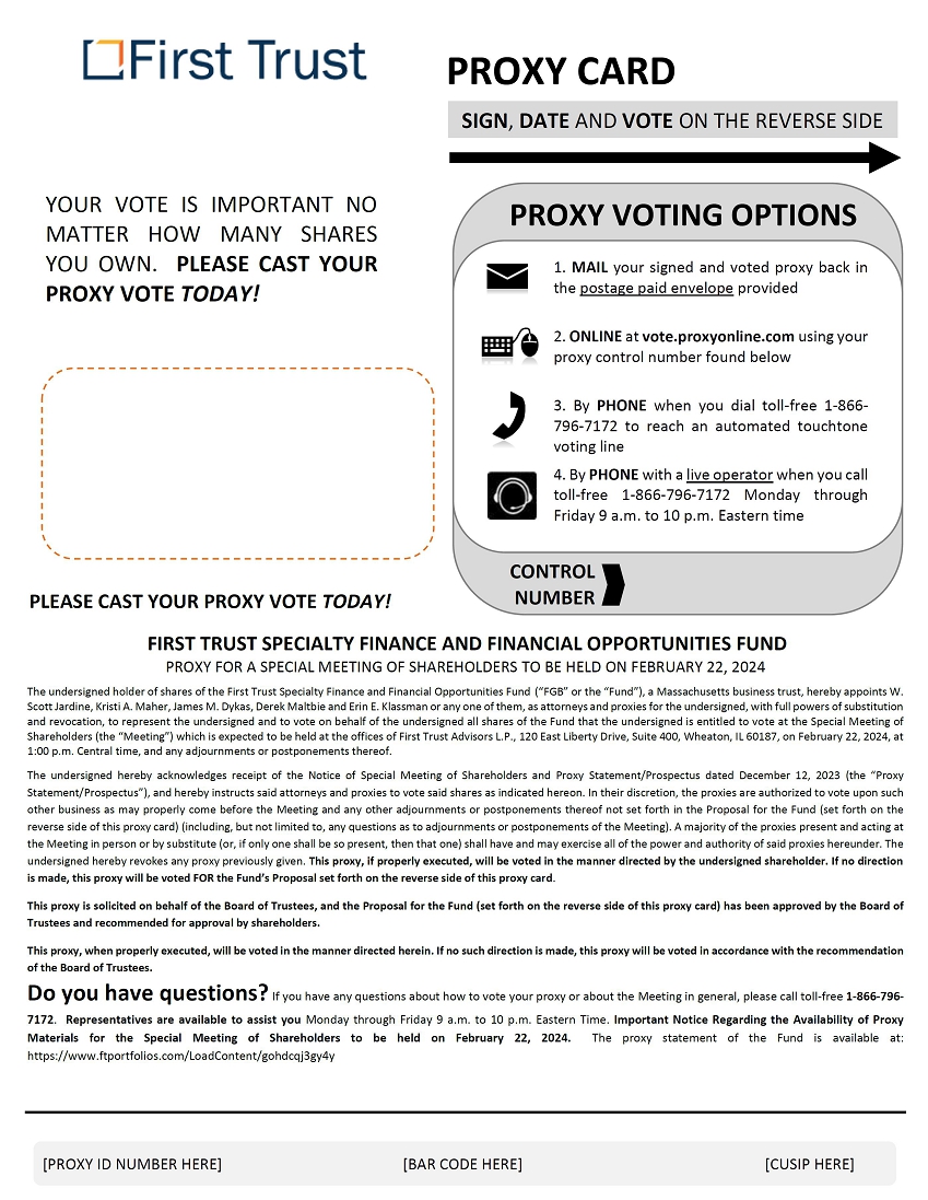 Notice is hereby given that a special meeting of shareholders (with any postponements or adjournments, the “Special Meeting”) of First Trust Specialty Finance and Financial Opportunities Fund (the “Acquired Fund”), a Massachusetts business trust, is scheduled to be held at the offices of the Acquired Fund’s investment adviser, First Trust Advisors L.P., located at 120 East Liberty Drive, Suite 400, Wheaton, IL 60187, on February 22, 2024, at 1:00 p.m. Central Time. At the Special Meeting, shareholders will be asked to consider and to vote on the below proposal (the “Proposal”).