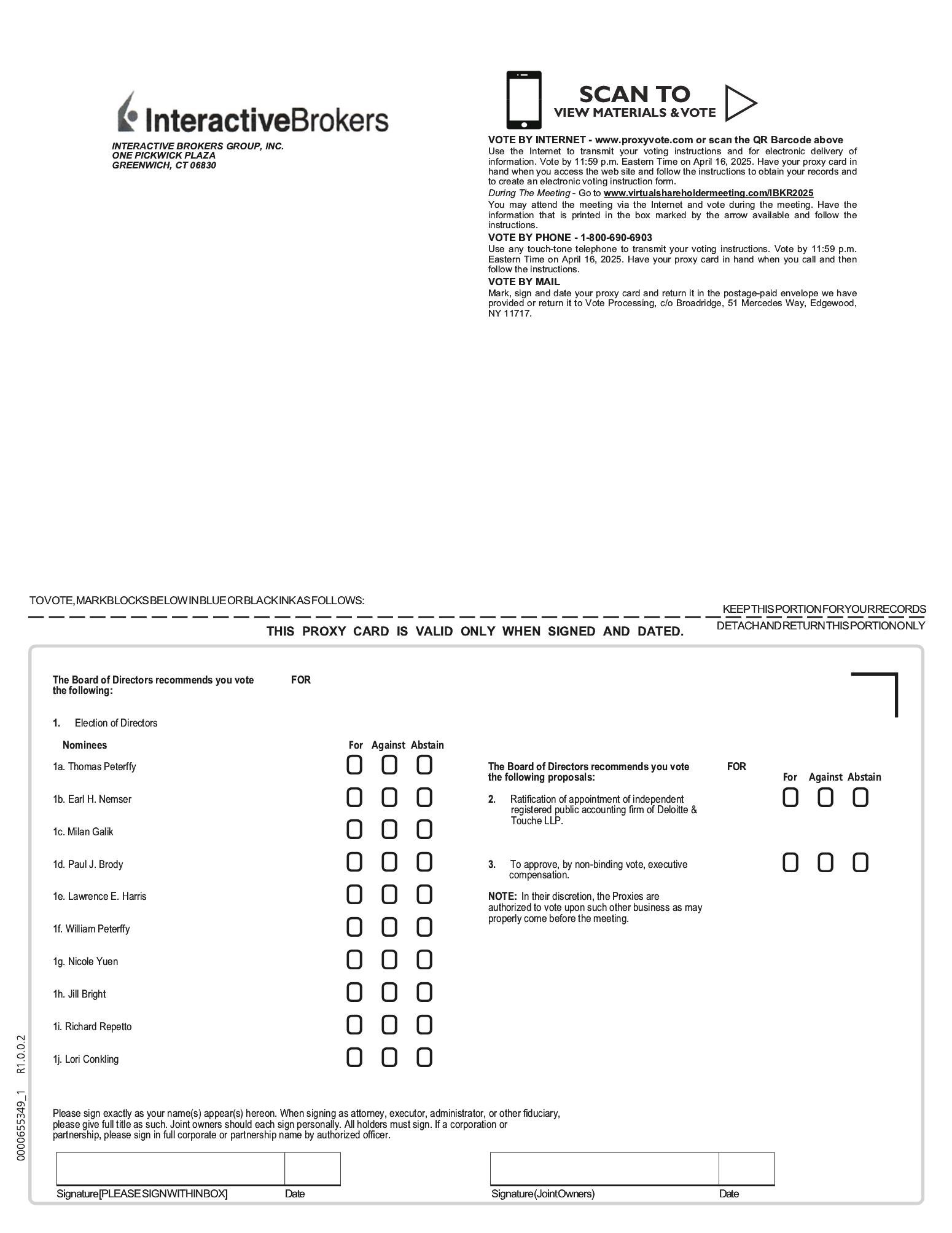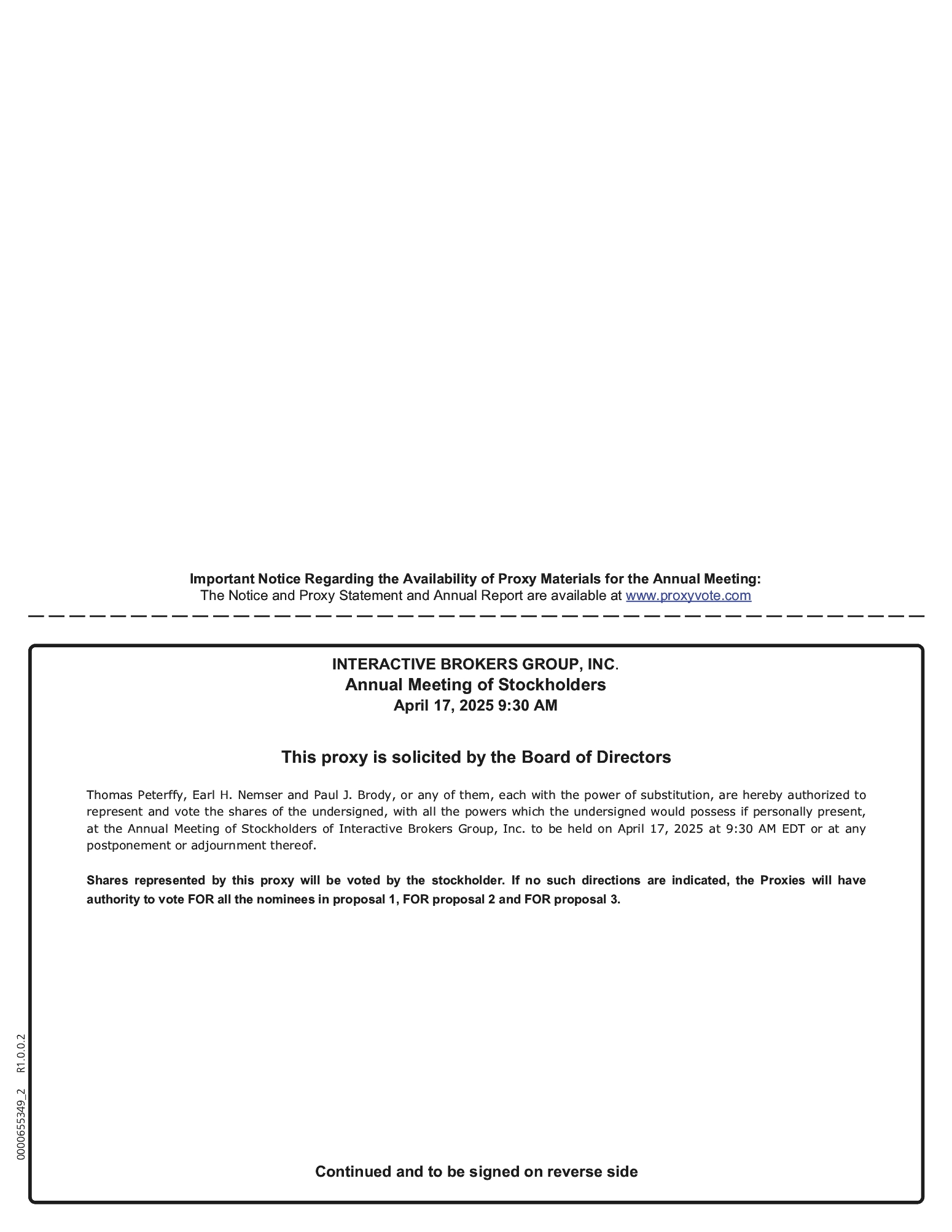 Mr. Earl H. Nemser has historically been compensated for his employment as Vice Chairman, reflecting contributions as legal counsel, as head of the IBG LLC Internal Audit Committee, as a member of the Company’s Steering Committee, in his role at ForecastEx, as a director of many of the Company’s subsidiaries, and, since 2023, as Chairman of Interactive Brokers (U.K.) Limited. The Compensation Committee has made its determination based on the assessments described above under “Setting Executive Compensation.” During 2024, Mr. Nemser was paid a salary of $755,000 by IBG LLC (inclusive of $180,000 of IBG LLC director fees) and a cash bonus of $1,000,000 in accordance with these practices. Mr. Nemser also received a stock award under the Stock Incentive Plan valued at $1,425,000 for the year ended December 31, 2024. During 2025, Mr. Nemser will be paid a salary of $770,000 by IBG LLC (inclusive of $180,000 of IBG LLC director fees).