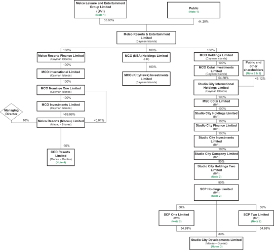 | • | “Melco Leisure” refers to Melco Leisure and Entertainment Group Limited, a company incorporated under the laws of the British Virgin Islands and a wholly-owned subsidiary of Melco International; |