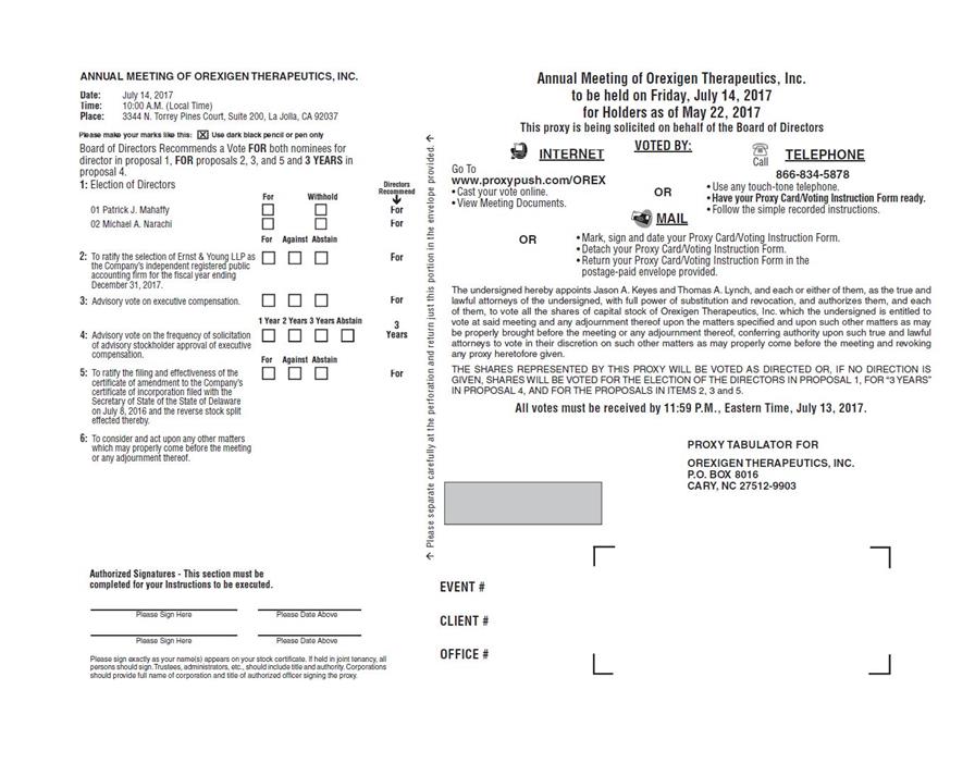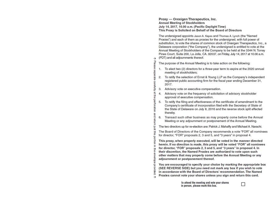 ANNUAL MEETING OF OREXIGEN THERAPEUTICS, INC. Date: July 14, 2017 Time: 10:00 A.M. (Local Time) Place: 3344 N. Torrey Pines Court, Suite 200, La Jolla, CA 92037 Please make your marks like this: Use dark black pencil or pen only Board of Directors Recommends a Vote FOR both nominees for Annual Meeting of Orexigen Therapeutics, Inc. to be held on Friday, July 14, 2017 for Holders as of May 22, 2017 This proxy is being solicited on behalf of the Board of Directors VOTED BY: director in proposal 1, FOR proposals 2, 3, and 5 and 3 YEARS in proposal 4. Go To INTERNET Call TELEPHONE 866-834-5878 1: Election of Directors 01 Patrick J. Mahaffy 02 Michael A. Narachi For Withhold Directors Recommend For For www.proxypush.com/OREX s Cast your vote online. View Meeting Documents. OR MAIL Use any touch-tone telephone. Have your Proxy Card/Voting Instruction Form ready. Follow the simple recorded instructions. 2: To ratify the selection of Ernst & Young LLP as the Company’s independent registered public accounting firm for the fiscal year ending December 31, 2017. 3: Advisory vote on executive compensation. 4: Advisory vote on the frequency of solicitation of advisory stockholder approval of executive compensation. 5: To ratify the filing and effectiveness of the certificate of amendment to the Company’s certificate of incorporation filed with the Secretary of State of the State of Delaware on July 8, 2016 and the reverse stock split effected thereby. 6: To consider and act upon any other matters which may properly come before the meeting or any adjournment thereof. For Against Abstain 1 Year 2 Years 3 Years Abstain For Against Abstain For For 3 Years For OR Mark, sign and date your Proxy Card/Voting Instruction Form. s Detach your Proxy Card/Voting Instruction Form. s Return your Proxy Card/Voting Instruction Form in the postage-paid envelope provided. The undersigned hereby appoints Jason A. Keyes and Thomas A. Lynch, and each or either of them, as the true and lawful attorneys of the undersigned, with full power of substitution and revocation, and authorizes them, and each of them, to vote all the shares of capital stock of Orexigen Therapeutics, Inc. which the undersigned is entitled to vote at said meeting and any adjournment thereof upon the matters specified and upon such other matters as may be properly brought before the meeting or any adjournment thereof, conferring authority upon such true and lawful attorneys to vote in their discretion on such other matters as may properly come before the meeting and revoking any proxy heretofore given. THE SHARES REPRESENTED BY THIS PROXY WILL BE VOTED AS DIRECTED OR, IF NO DIRECTION IS GIVEN, SHARES WILL BE VOTED FOR THE ELECTION OF THE DIRECTORS IN PROPOSAL 1, FOR “3 YEARS” IN PROPOSAL 4, AND FOR THE PROPOSALS IN ITEMS 2, 3 and 5. All votes must be received by 11:59 P.M., Eastern Time, July 13, 2017. PROXY TABULATOR FOR OREXIGEN THERAPEUTICS, INC. P.O. BOX 8016 CARY, NC 27512-9903 Authorized Signatures - This section must be completed for your Instructions to be executed. Please Sign Here Please Date Above Please Sign Here Please Date Above Please sign exactly as your name(s) appears on your stock certificate. If held in joint tenancy, all persons should sign. Trustees, administrators, etc., should include title and authority. Corporations should provide full name of corporation and title of authorized officer signing the proxy. EVENT # CLIENT # OFFICE #