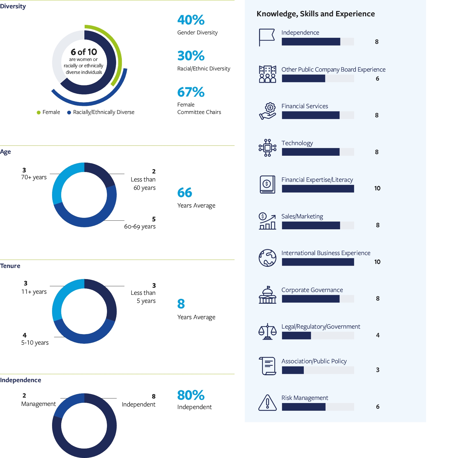 Each of the director nominees for election at the 2024 Annual Meeting holds or has held senior executive positions in large, complex organizations, and many hold or have held the role of chief executive officer. This experience demonstrates their ability to perform at the highest levels, enabling them to provide sound judgment concerning the issues facing a large public corporation in today’s environment, provide oversight and evaluate our performance. | ||||||||||||||