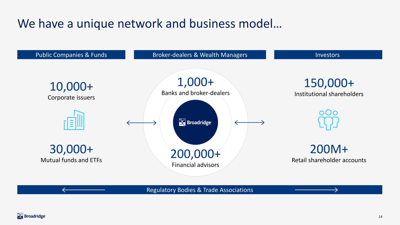 14 We have a unique network and business model… Regulatory Bodies & Trade Associations Broker-dealers & Wealth Managers Investors Public Companies & Funds 10,000+ Corporate issuers 1,000+ Banks and broker-dealers 30,000+ Mutual funds and ETFs 200,000+ Financial advisors 150,000+ Institutional shareholders 200M+ Retail shareholder accounts