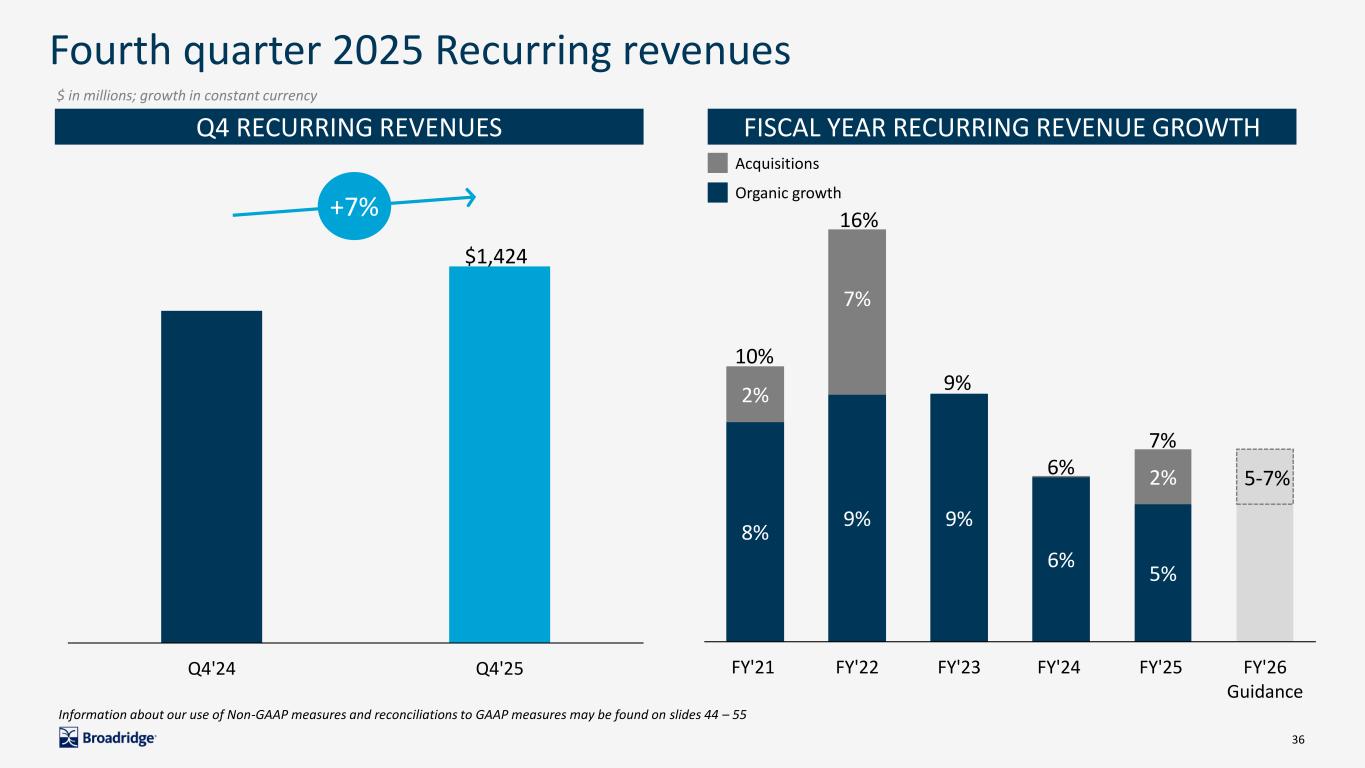 3 Use of Non-GAAP financial Measures, KPIs and foreign exchange rates Use of Non-GAAP Financial Measures This presentation includes certain Non-GAAP financial measures including Adjusted Operating income, Adjusted Operating income margin, Adjusted Net earnings, Adjusted earnings per share (“EPS”), Free cash flow, Free cash flow conversion, and Recurring revenue growth constant currency. Please see the “Explanation of Non-GAAP Measures and Reconciliation of GAAP to Non-GAAP Measures” section of this presentation for more information on Broadridge’s use of Non-GAAP measures and reconciliations to GAAP measures. Key Performance Indicators Management focuses on a variety of key indicators to plan, measure and evaluate the Company’s business and financial performance. These performance indicators include Revenues and Recurring revenue, as well as Non-GAAP measures of Adjusted Operating income, Adjusted Net earnings, Adjusted EPS, Free cash flow, Free cash flow conversion, Recurring revenue growth constant currency, and Closed sales. In addition, management focuses on select operating metrics specific to Broadridge of Position Growth, which is comprised of equity position growth and mutual fund/ETF position growth, and Internal Trade Growth. Beginning in the fourth quarter of fiscal year 2025, the Company began presenting information on “equity revenue position growth”. Equity revenue position growth excludes small or fractional equity positions for which the Company does not recognize revenue (“non-revenue positions”). Prior-year period comparative information for this metric is not available. Please refer to Item 2. Management’s Discussion and Analysis of Financial Condition of the 2025 Annual Report for a discussion of Revenues, Recurring revenue, Position Growth and Internal Trade Growth in the “Key Performance Indicators” section and the “Results of Operations” section for a description of Closed sales. Foreign Exchange Rates Beginning with the first quarter of fiscal year 2023, the Company changed reporting for segment revenues, segment earnings (loss) before income taxes, segment amortization of acquired intangibles and purchased intellectual property, and Closed sales to reflect the impact of actual foreign exchange rates applicable to the individual periods presented. The presentation of these metrics for the prior periods has been changed to conform to the current period presentation. Total consolidated revenues and earnings before income taxes were not impacted. Notes on Presentation Amounts presented in this presentation may not sum due to rounding. All FY’25 Recurring revenue dollar amounts shown in this presentation are GAAP. Recurring revenue growth percentages for FY’23, FY’24, FY’25 and FY’26 Guidance are shown as constant currency (Non- GAAP). Recurring revenue growth percentages for FY’16 through FY’22 are calculated based on constant foreign currency exchange rates used for internal management reporting as described in the Company’s segment footnote within its Form 10-K for each respective year. Use of Material Contained Herein The information contained in this presentation is being provided for your convenience and information only. This information is accurate as of the date of its initial presentation. If you plan to use this information for any purpose, verification of its continued accuracy is your responsibility. Broadridge assumes no duty to update or revise the information contained in this presentation.