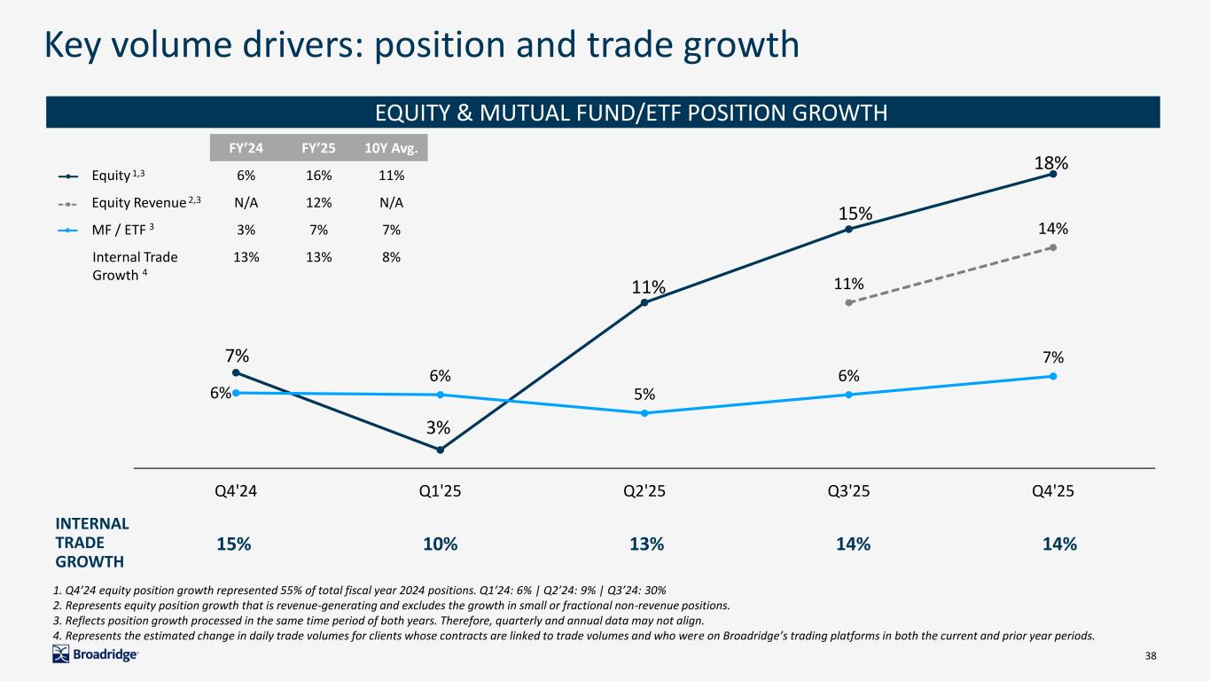 38 FY’24 FY’25 10Y Avg. Equity 6% 16% 11% Equity Revenue N/A 12% N/A MF / ETF 3% 7% 7% Internal Trade Growth 13% 13% 8% 7% 3% 11% 15% 18% 11% 14% 6% 6% 5% 6% 7% Q4'24 Q1'25 Q2'25 Q3'25 Q4'25 Key volume drivers: position and trade growth 15% 10% 13% 14% 14% INTERNAL TRADE GROWTH EQUITY & MUTUAL FUND/ETF POSITION GROWTH 1. Q4’24 equity position growth represented 55% of total fiscal year 2024 positions. Q1’24: 6% | Q2’24: 9% | Q3’24: 30% 2. Represents equity position growth that is revenue-generating and excludes the growth in small or fractional non-revenue positions. 3. Reflects position growth processed in the same time period of both years. Therefore, quarterly and annual data may not align. 4. Represents the estimated change in daily trade volumes for clients whose contracts are linked to trade volumes and who were on Broadridge’s trading platforms in both the current and prior year periods. 1,3 2,3 3 4