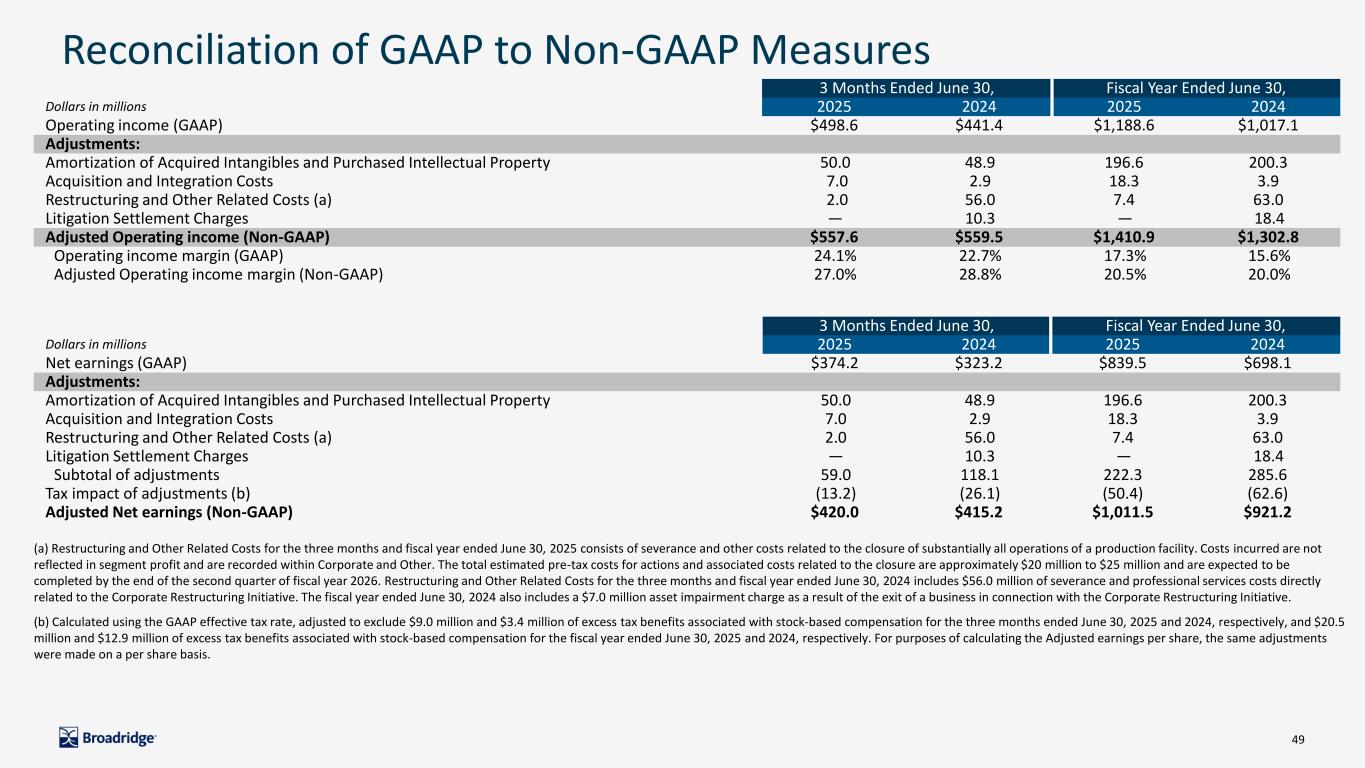 49 3 Months Ended June 30, Fiscal Year Ended June 30, Dollars in millions 2025 2024 2025 2024 Net earnings (GAAP) $374.2 $323.2 $839.5 $698.1 Adjustments: Amortization of Acquired Intangibles and Purchased Intellectual Property 50.0 48.9 196.6 200.3 Acquisition and Integration Costs 7.0 2.9 18.3 3.9 Restructuring and Other Related Costs (a) 2.0 56.0 7.4 63.0 Litigation Settlement Charges — 10.3 — 18.4 Subtotal of adjustments 59.0 118.1 222.3 285.6 Tax impact of adjustments (b) (13.2) (26.1) (50.4) (62.6) Adjusted Net earnings (Non-GAAP) $420.0 $415.2 $1,011.5 $921.2 Reconciliation of GAAP to Non-GAAP Measures 3 Months Ended June 30, Fiscal Year Ended June 30, Dollars in millions 2025 2024 2025 2024 Operating income (GAAP) $498.6 $441.4 $1,188.6 $1,017.1 Adjustments: Amortization of Acquired Intangibles and Purchased Intellectual Property 50.0 48.9 196.6 200.3 Acquisition and Integration Costs 7.0 2.9 18.3 3.9 Restructuring and Other Related Costs (a) 2.0 56.0 7.4 63.0 Litigation Settlement Charges — 10.3 — 18.4 Adjusted Operating income (Non-GAAP) $557.6 $559.5 $1,410.9 $1,302.8 Operating income margin (GAAP) 24.1% 22.7% 17.3% 15.6% Adjusted Operating income margin (Non-GAAP) 27.0% 28.8% 20.5% 20.0% (a) Restructuring and Other Related Costs for the three months and fiscal year ended June 30, 2025 consists of severance and other costs related to the closure of substantially all operations of a production facility. Costs incurred are not reflected in segment profit and are recorded within Corporate and Other. The total estimated pre-tax costs for actions and associated costs related to the closure are approximately $20 million to $25 million and are expected to be completed by the end of the second quarter of fiscal year 2026. Restructuring and Other Related Costs for the three months and fiscal year ended June 30, 2024 includes $56.0 million of severance and professional services costs directly related to the Corporate Restructuring Initiative. The fiscal year ended June 30, 2024 also includes a $7.0 million asset impairment charge as a result of the exit of a business in connection with the Corporate Restructuring Initiative. (b) Calculated using the GAAP effective tax rate, adjusted to exclude $9.0 million and $3.4 million of excess tax benefits associated with stock-based compensation for the three months ended June 30, 2025 and 2024, respectively, and $20.5 million and $12.9 million of excess tax benefits associated with stock-based compensation for the fiscal year ended June 30, 2025 and 2024, respectively. For purposes of calculating the Adjusted earnings per share, the same adjustments were made on a per share basis.