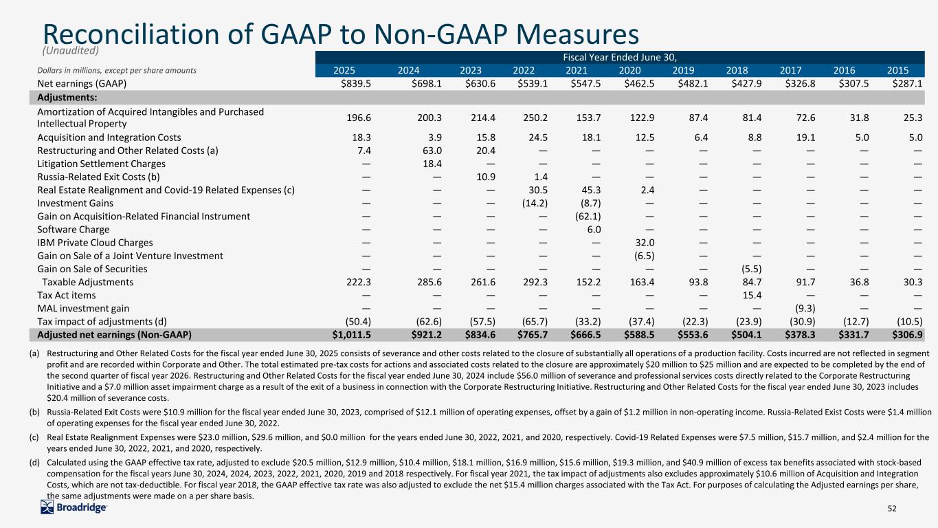 51 3 Months Ended June 30, Fiscal Year Ended June 30, Fiscal Year Ended June 30, Dollars in millions, except per share amounts 2025 2024 2025 2024 Diluted earnings per share (GAAP) $3.16 $2.72 $7.10 $5.86 Adjustments: Amortization of Acquired Intangibles and Purchased Intellectual Property 0.42 0.41 1.66 1.68 Acquisition and Integration Costs 0.06 0.02 0.15 0.03 Restructuring and Other Related Costs (a) 0.02 0.47 0.06 0.53 Litigation Settlement Charges — 0.09 — 0.15 Subtotal of adjustments 0.50 0.99 1.88 2.40 Tax impact of adjustments (b) (0.11) (0.22) (0.43) (0.53) Adjusted earnings per share (Non-GAAP) $3.55 $3.50 $8.55 $7.73 Reconciliation of GAAP to Non-GAAP Measures (Unaudited) (a) Restructuring and Other Related Costs for the three month and fiscal year ended June 30, 2025 consists of severance and other costs related to the closure of substantially all operations of a production facility. Costs incurred are not reflected in segment profit and are recorded within Corporate and Other. The total estimated pre-tax costs for actions and associated costs related to the closure are approximately $20 million to $25 million and are expected to be completed by the end of the second quarter of fiscal year 2026. Restructuring and Other Related Costs for the three months and fiscal year ended June 30, 2024 includes $56.0 million of severance and professional services costs directly related to the Corporate Restructuring Initiative. The fiscal year ended June 30, 2024 also includes a $7.0 million asset impairment charge as a result of the exit of a business in connection with the Corporate Restructuring Initiative. (b) Calculated using the GAAP effective tax rate, adjusted to exclude $9.0 million and $3.4 million of excess tax benefits associated with stock-based compensation for the three months ended June 30, 2025 and 2024, respectively, and $20.5 million and $12.9 million of excess tax benefits associated with stock-based compensation for the fiscal year ended June 30, 2025 and 2024, respectively. For purposes of calculating the Adjusted earnings per share, the same adjustments were made on a per share basis. Fiscal Year Ended June 30, Fiscal Year Ended June 30, Dollars in millions 2025 2024 Net cash flows from operating activities (GAAP) $1,171.3 $1,056.2 Capital expenditures and Software purchases and capitalized internal use software (114.9) (113.0) Free cash flow (Non-GAAP) $1,056.4 $943.2