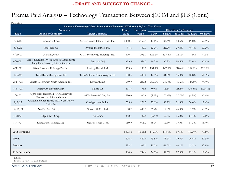 - DRAFT AND SUBJECT TO CHANGE - Premia Paid Analysis – Technology Transaction Between $100M and $1B (Cont.) ($ in millions) Selected Technology M&A Transactions Between $100M and $1B, Last Two Years Announce Equity Enterprise Offer Price % Premium Date Acquirer Company Target Company Value Value 1-Day 5-Days 30-Days 60-Days 90-Days a 5/9/22 Concentrix Corp. ServiceSource International, Inc. $ 150.4 $ 159.1 47.1% 37.6% 14.5% 19.0% 52.5% 5/5/22 Latécoère SA Avcorp Industries, Inc. 31.8 109.3 22.2% 22.2% 29.4% 46.7% 69.2% 4/29/22 GI Manager LP GTY Technology Holdings, Inc. 376.7 395.1 122.6% 138.6% 72.1% 41.9% 8.2% Accel-KKR; Briarwood Chase Management; 4/14/22 Basware Oyj 493.5 554.5 94.7% 93.7% 80.6% 77.4% 30.0% Long Path Partners; Private Groups 4/11/22 Pfizer Australia Holdings Pty Ltd. ResApp Health Ltd. 133.3 130.9 131.1% 147.6% 210.4% 184.9% 220.0% 4/6/22 Turn/River Management LP Tufin Software Technologies Ltd. 500.4 438.2 44.0% 44.8% 56.8% 48.8% 54.7% 2/14/22 Murata Electronics North America, Inc. Resonant, Inc. 289.9 282.8 262.9% 216.9% 163.2% 144.6% 74.4% 1/31/22 Agrico Acquisition Corp. Kalera AS 191.6 191.6 0.0% 12.5% (28.1%) (36.3%) (72.6%) Alpha Luck Industrial; AKM Meadville 1/14/22 AKM Industrial Co., Ltd. 230.0 380.6 (5.9%) (7.8%) (10.0%) (6.3%) 80.4% Electronics.; Private Groups Clayton Dubilier & Rice LLC; Vera Whole 1/5/22 Castlight Health, Inc. 335.5 278.7 25.0% 36.7% 21.3% 30.6% 12.6% Health, Inc. 12/16/21 NAT GAMES Co., Ltd. Nexon GT Co., Ltd. 550.7 493.5 2.3% 17.8% 46.3% 81.2% 60.5% 11/8/21 Open Text Corp. Zix Corp. 482.7 789.9 (2.7%) 3.7% 15.2% 14.7% 19.0% 11/4/21 Lumentum Holdings, Inc. NeoPhotonics Corp. 859.0 815.3 38.9% 62.3% 77.0% 64.3% 56.4% 75th Percentile $ 495.2 $ 561.5 112.9% 114.1% 99.1% 102.4% 70.5% Mean 364.8 427.0 75.8% 75.2% 73.8% 66.4% 47.5% Median 332.8 389.1 53.0% 61.9% 60.1% 62.8% 47.9% 25th Percentile 184.6 244.6 24.3% 31.6% 27.4% 29.1% 17.4% Notes: Source: FactSet Research Systems NEEDHAM & COMPANY STRICTLY PRIVATE & CONFIDENTIAL 12