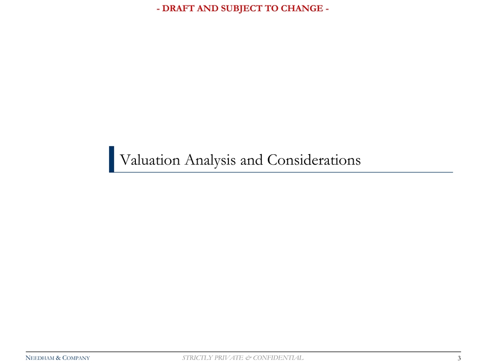 - DRAFT AND SUBJECT TO CHANGE - Valuation Analysis and Considerations NEEDHAM & COMPANY STRICTLY PRIVATE & CONFIDENTIAL 3