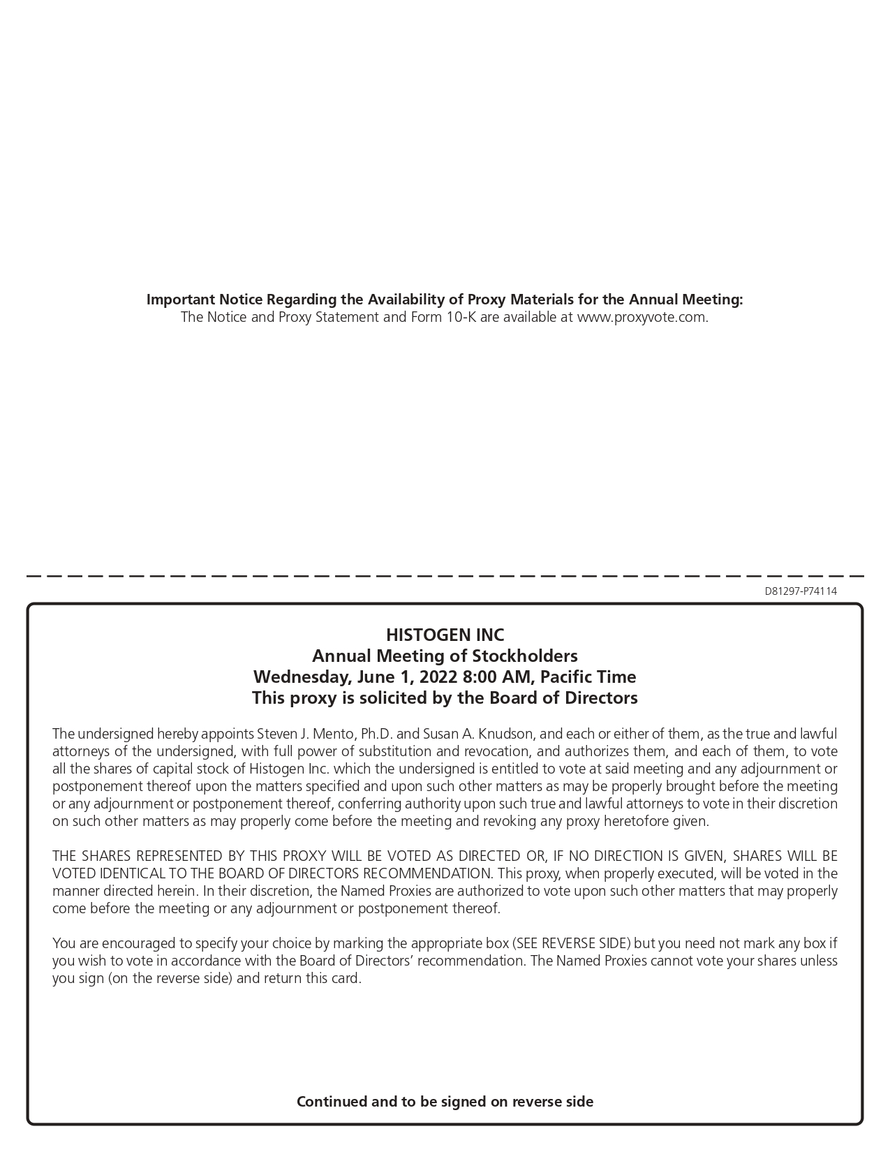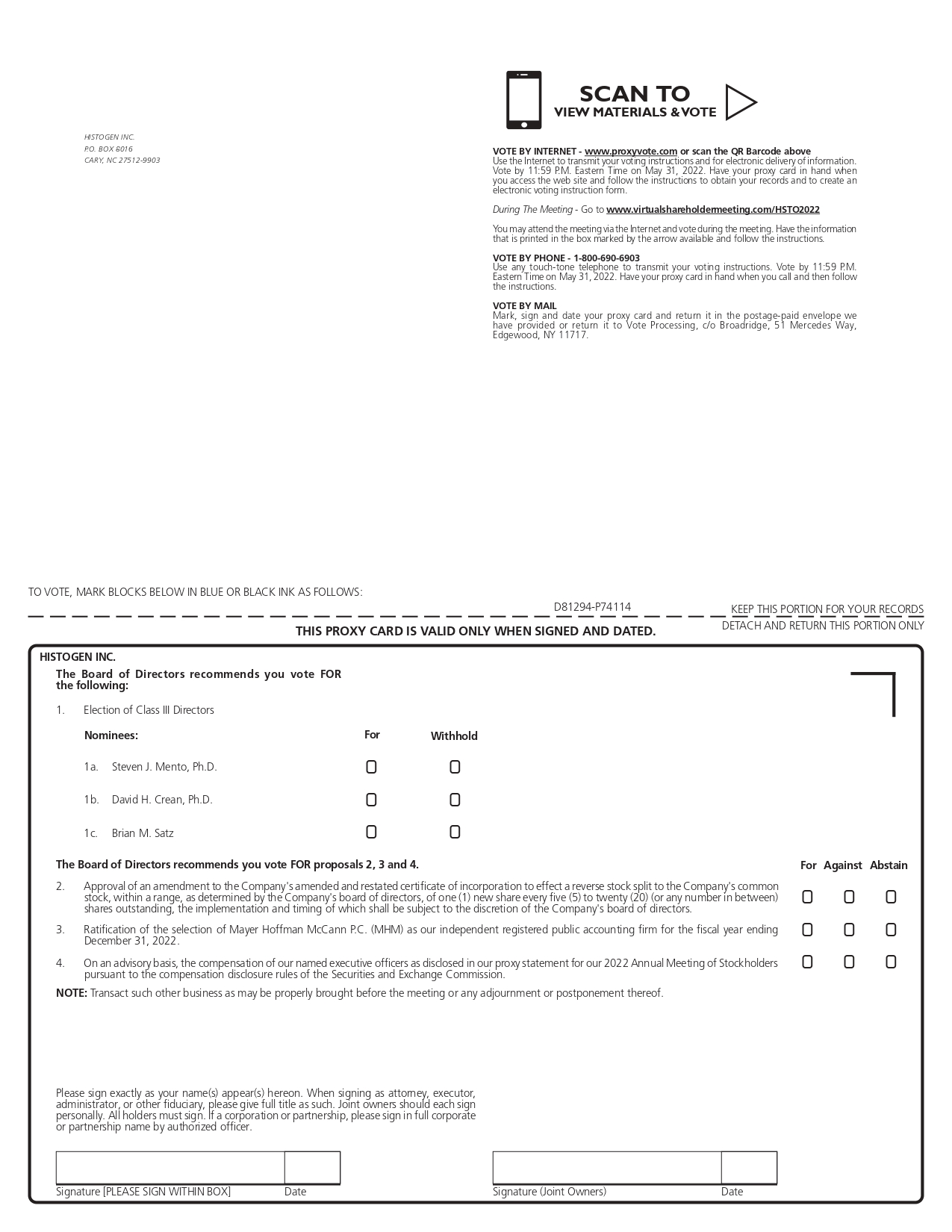 HISTOGEN INC PO BOX 8016 CARY NC 27512-9903 GRAPHICS SCAN TO VIEW MATERIALS & VOTE GRAPHICS VOTE BY INTERNET - wwwproxyvotecom or scan the QR Barcode above Use the Internet to transmit your voting instructions and for electronic delivery of information Vote by 1159 PM Eastern Time on May 31 2022 Have your proxy card in hand when you access the web site and follow the instructions to obtain your records and to create an electronic voting instruction form During The Meeting - Go to wwwvirtualshareholdermeetingcom/HSTO2022 You may attend the meeting via the Internet and vote during the meeting Have the information that is printed in the box marked by the arrow available and follow the instructions VOTE BY PHONE - 1-800-690-6903 Use any touch-tone telephone to transmit your voting instructions Vote by 1159 PM Eastern Time on May 31 2022 Have your proxy card in hand when you call and then follow the instructions VOTE BY MAIL Mark sign and date your proxy card and return it in the postage-paid envelope we have provided or return it to Vote Processing c/o Broadridge 51 Mercedes Way Edgewood NY 11717 TO VOTE MARK BLOCKS BELOW IN BLUE OR BLACK INK AS FOLLOWS D81294-P74114 KEEP THIS PORTION FOR YOUR RECORDS THIS PROXY CARD IS VALID ONLY WHEN SIGNED AND DATED DETACH AND RETURN THIS PORTION ONLY HISTOGEN INC The Board of Directors recommends you vote FOR the following 1 Election of Class III Directors Nominees For Withhold 1a Steven J Mento PhD 1b David H Crean PhD 1c Brian M Satz The Board of Directors recommends you vote FOR proposals 2 3 and 4 For Against Abstain 2 Approval of an amendment to the Company's amended and restated certificate of incorporation to effect a reverse stock split to the Company's common stock within a range as determined by the Company's board of directors of one (1) new share every five (5) to twenty (20) (or any number in between) shares outstanding the implementation and timing of which shall be subject to the discretion of the Company's board of directors 3 Ratification of the selection of Mayer Hoffman McCann PC (MHM) as our independent registered public accounting firm for the fiscal year ending December 31 2022 4 On an advisory basis the compensation of our named executive officers as disclosed in our proxy statement for our 2022 Annual Meeting of Stockholders pursuant to the compensation disclosure rules of the Securities and Exchange Commission NOTE Transact such other business as may be properly brought before the meeting or any adjournment or postponement thereof Please sign exactly as your name(s) appear(s) hereon When signing as attorney executor administrator or other fiduciary please give full title as such Joint owners should each sign personally All holders must sign If a corporation or partnership please sign in full corporate or partnership name by authorized officer Signature [PLEASE SIGN WITHIN BOX] Date Signature (Joint Owners) Date