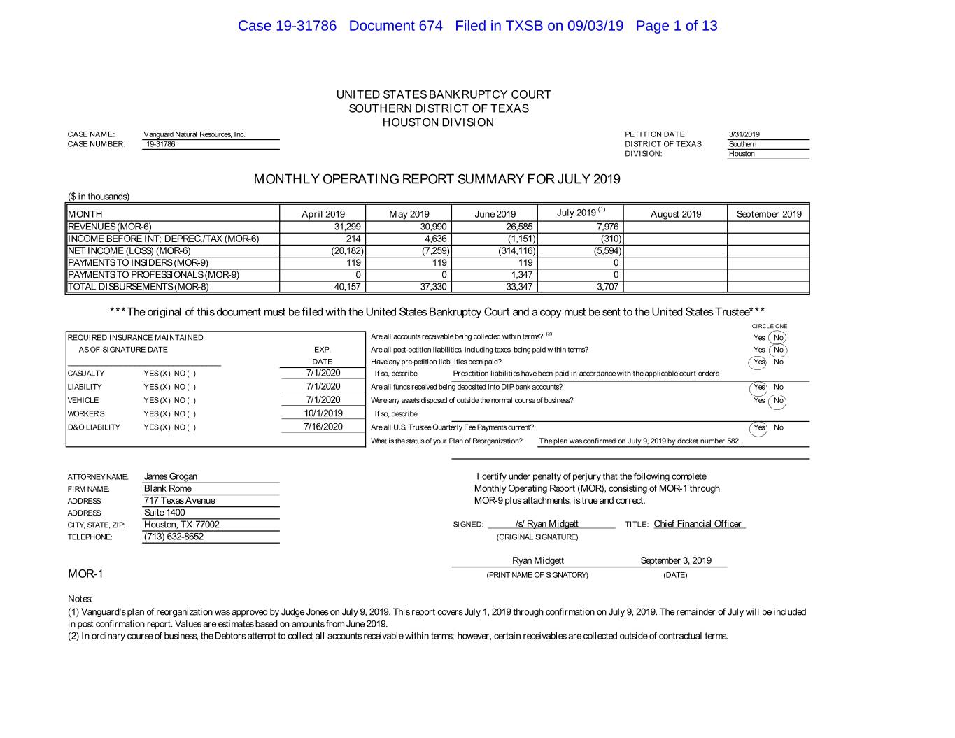 Case 19-31786 Document 674 Filed in TXSB on 09/03/19 Page 1 of 13 UNITED STATES BANKRUPTCY COURT SOUTHERN DISTRICT OF TEXAS HOUSTON DIVISION CASE NAME: Vanguard Natural Resources, Inc. PETITION DATE: 3/31/2019 CASE NUMBER: 19-31786 DISTRICT OF TEXAS: Southern DIVISION: Houston MONTHLY OPERATING REPORT SUMMARY FOR JULY 2019 ($ in thousands) (1) MONTH April 2019 May 2019 June 2019 July 2019 August 2019 September 2019 REVENUES (MOR-6) 31,299 30,990 26,585 7,976 INCOME BEFORE INT; DEPREC./TAX (MOR-6) 214 4,636 (1,151) (310) NET INCOME (LOSS) (MOR-6) (20,182) (7,259) (314,116) (5,594) PAYMENTS TO INSIDERS (MOR-9) 119 119 119 0 PAYMENTS TO PROFESSIONALS (MOR-9) 0 0 1,347 0 TOTAL DISBURSEMENTS (MOR-8) 40,157 37,330 33,347 3,707 ***The original of this document must be filed with the United States Bankruptcy Court and a copy must be sent to the United States Trustee*** CIRCLE ONE (2) REQUIRED INSURANCE MAINTAINED Are all accounts receivable being collected within terms? Yes No AS OF SIGNATURE DATE EXP. Are all post-petition liabilities, including taxes, being paid within terms? Yes No ________________________________ DATE Have any pre-petition liabilities been paid? Yes No CASUALTY YES (X) NO ( ) 7/1/2020 If so, describe Prepetition liabilities have been paid in accordance with the applicable court orders LIABILITY YES (X) NO ( ) 7/1/2020 Are all funds received being deposited into DIP bank accounts? Yes No VEHICLE YES (X) NO ( ) 7/1/2020 Were any assets disposed of outside the normal course of business? Yes No WORKER'S YES (X) NO ( ) 10/1/2019 If so, describe D&O LIABILITY YES (X) NO ( ) 7/16/2020 Are all U.S. Trustee Quarterly Fee Payments current? Yes No What is the status of your Plan of Reorganization? The plan was confirmed on July 9, 2019 by docket number 582. ATTORNEY NAME: James Grogan I certify under penalty of perjury that the following complete FIRM NAME: Blank Rome Monthly Operating Report (MOR), consisting of MOR-1 through ADDRESS: 717 Texas Avenue MOR-9 plus attachments, is true and correct. ADDRESS: Suite 1400 CITY, STATE, ZIP: Houston, TX 77002 SIGNED: /s/ Ryan Midgett TITLE: Chief Financial Officer TELEPHONE: (713) 632-8652 (ORIGINAL SIGNATURE) Ryan Midgett September 3, 2019 MOR-1 (PRINT NAME OF SIGNATORY) (DATE) Notes: (1) Vanguard's plan of reorganization was approved by Judge Jones on July 9, 2019. This report covers July 1, 2019 through confirmation on July 9, 2019. The remainder of July will be included in post confirmation report. Values are estimates based on amounts from June 2019. (2) In ordinary course of business, the Debtors attempt to collect all accounts receivable within terms; however, certain receivables are collected outside of contractual terms.