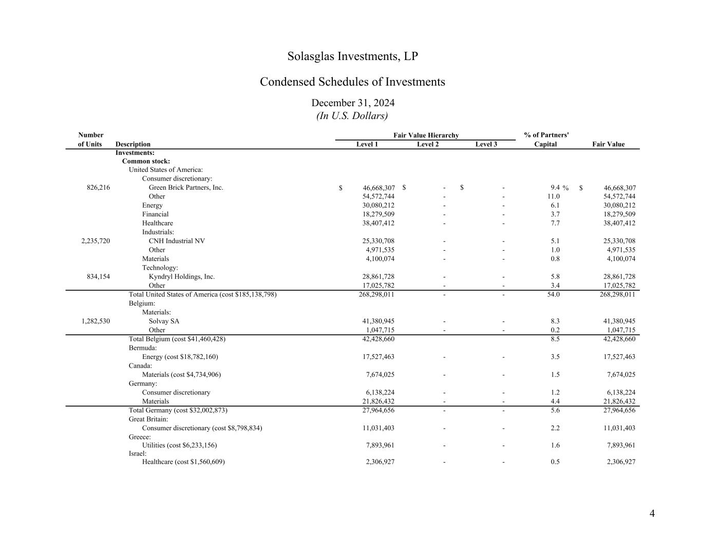 Description Level 1 Level 2 Level 3 Investments: Common stock: United States of America: Consumer discretionary: 826,216 Green Brick Partners, Inc. 46,668,307$ -$ -$ 9.4 % 46,668,307$ Other 54,572,744 - - 11.0 54,572,744 Energy 30,080,212 - - 6.1 30,080,212 Financial 18,279,509 - - 3.7 18,279,509 Healthcare 38,407,412 - - 7.7 38,407,412 Industrials: 2,235,720 CNH Industrial NV 25,330,708 - - 5.1 25,330,708 Other 4,971,535 - - 1.0 4,971,535 Materials 4,100,074 - - 0.8 4,100,074 Technology: 834,154 Kyndryl Holdings, Inc. 28,861,728 - - 5.8 28,861,728 Other 17,025,782 - - 3.4 17,025,782 Total United States of America (cost $185,138,798) 268,298,011 - - 54.0 268,298,011 Belgium: Materials: 1,282,530 Solvay SA 41,380,945 - - 8.3 41,380,945 Other 1,047,715 - - 0.2 1,047,715 Total Belgium (cost $41,460,428) 42,428,660 8.5 42,428,660 Bermuda: Energy (cost $18,782,160) 17,527,463 - - 3.5 17,527,463 Canada: Materials (cost $4,734,906) 7,674,025 - - 1.5 7,674,025 Germany: Consumer discretionary 6,138,224 - - 1.2 6,138,224 Materials 21,826,432 - - 4.4 21,826,432 Total Germany (cost $32,002,873) 27,964,656 - - 5.6 27,964,656 Great Britain: Consumer discretionary (cost $8,798,834) 11,031,403 - - 2.2 11,031,403 Greece: Utilities (cost $6,233,156) 7,893,961 - - 1.6 7,893,961 Israel: Healthcare (cost $1,560,609) 2,306,927 - - 0.5 2,306,927 Solasglas Investments, LP Condensed Schedules of Investments Number of Units Fair Value Hierarchy Fair Value December 31, 2024 % of Partners' Capital (In U.S. Dollars) 4