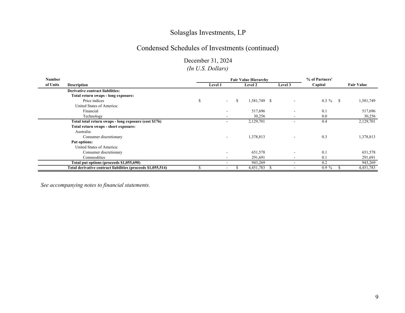 Description Level 1 Level 2 Level 3 Derivative contract liabilities: Total return swaps - long exposure: Price indices -$ 1,581,749$ -$ 0.3 % 1,581,749$ United States of America: Financial - 517,696 - 0.1 517,696 Technology - 30,256 - 0.0 30,256 Total total return swaps - long exposure (cost $176) - 2,129,701 - 0.4 2,129,701 Total return swaps - short exposure: Australia: Consumer discretionary - 1,378,813 - 0.3 1,378,813 Put options: United States of America: Consumer discretionary - 651,578 - 0.1 651,578 Commodities - 291,691 - 0.1 291,691 Total put options (proceeds $1,055,690) - 943,269 - 0.2 943,269 Total derivative contract liabilities (proceeds $1,055,514) -$ 4,451,783$ -$ 0.9 % 4,451,783$ See accompanying notes to financial statements. Fair Value Hierarchy Fair Value (In U.S. Dollars) Solasglas Investments, LP Condensed Schedules of Investments (continued) December 31, 2024 % of Partners' Capital Number of Units 9