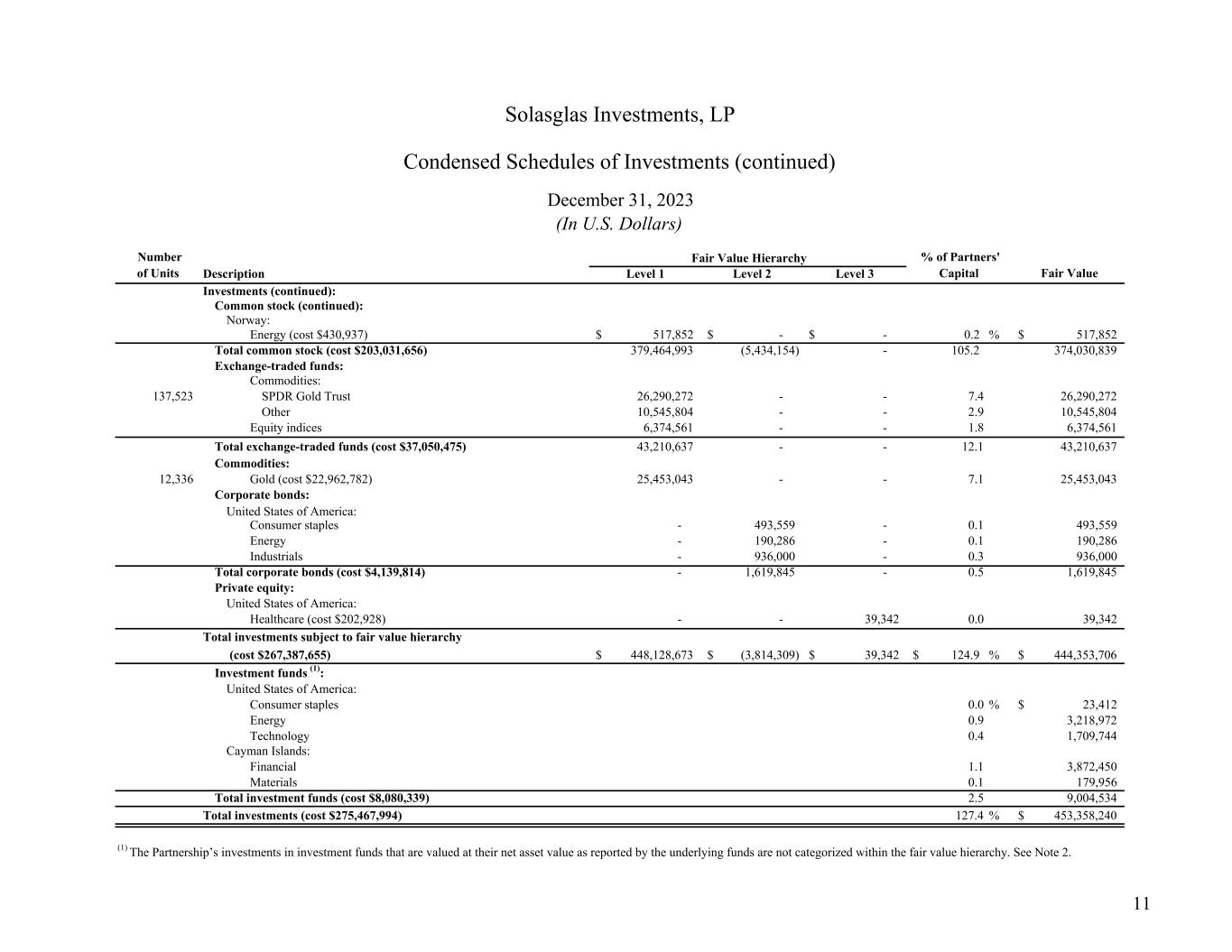 Description Level 1 Level 2 Level 3 Investments (continued): Common stock (continued): Norway: Energy (cost $430,937) 517,852$ -$ -$ 0.2 % 517,852$ Total common stock (cost $203,031,656) 379,464,993 (5,434,154) - 105.2 374,030,839 Exchange-traded funds: Commodities: 137,523 SPDR Gold Trust 26,290,272 - - 7.4 26,290,272 Other 10,545,804 - - 2.9 10,545,804 Equity indices 6,374,561 - - 1.8 6,374,561 Total exchange-traded funds (cost $37,050,475) 43,210,637 - - 12.1 43,210,637 Commodities: 12,336 Gold (cost $22,962,782) 25,453,043 - - 7.1 25,453,043 Corporate bonds: United States of America: Consumer staples - 493,559 - 0.1 493,559 Energy - 190,286 - 0.1 190,286 Industrials - 936,000 - 0.3 936,000 Total corporate bonds (cost $4,139,814) - 1,619,845 - 0.5 1,619,845 Private equity: United States of America: Healthcare (cost $202,928) - - 39,342 0.0 39,342 Total investments subject to fair value hierarchy (cost $267,387,655) 448,128,673$ (3,814,309)$ 39,342$ 124.9$ % 444,353,706$ Investment funds (1): United States of America: Consumer staples 0.0 % 23,412$ Energy 0.9 3,218,972 Technology 0.4 1,709,744 Cayman Islands: Financial 1.1 3,872,450 Materials 0.1 179,956 Total investment funds (cost $8,080,339) 2.5 9,004,534 Total investments (cost $275,467,994) 127.4 % 453,358,240$ (1) The Partnership’s investments in investment funds that are valued at their net asset value as reported by the underlying funds are not categorized within the fair value hierarchy. See Note 2. Solasglas Investments, LP Condensed Schedules of Investments (continued) Number of Units Fair Value Hierarchy Fair Value December 31, 2023 % of Partners' Capital (In U.S. Dollars) 11
