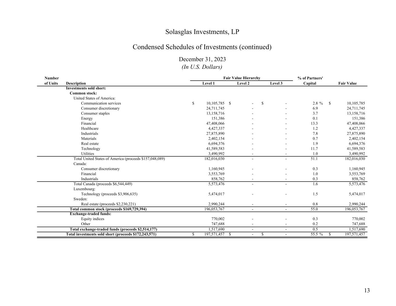 Description Level 1 Level 2 Level 3 Investments sold short: Common stock: United States of America: Communication services 10,105,785$ -$ -$ 2.8 % 10,105,785$ Consumer discretionary 24,711,745 - - 6.9 24,711,745 Consumer staples 13,158,716 - - 3.7 13,158,716 Energy 151,386 - - 0.1 151,386 Financial 47,408,066 - - 13.3 47,408,066 Healthcare 4,427,337 - - 1.2 4,427,337 Industrials 27,875,890 - - 7.8 27,875,890 Materials 2,402,154 - - 0.7 2,402,154 Real estate 6,694,376 - - 1.9 6,694,376 Technology 41,589,583 - - 11.7 41,589,583 Utilities 3,490,992 - - 1.0 3,490,992 Total United States of America (proceeds $157,048,089) 182,016,030 - - 51.1 182,016,030 Canada: Consumer discretionary 1,160,945 - - 0.3 1,160,945 Financial 3,553,769 - - 1.0 3,553,769 Industrials 858,762 - - 0.3 858,762 Total Canada (proceeds $6,544,449) 5,573,476 - - 1.6 5,573,476 Luxembourg: Technology (proceeds $3,906,635) 5,474,017 - - 1.5 5,474,017 Sweden: Real estate (proceeds $2,230,221) 2,990,244 - - 0.8 2,990,244 Total common stock (proceeds $169,729,394) 196,053,767 - - 55.0 196,053,767 Exchange-traded funds: Equity indices 770,002 - - 0.3 770,002 Other 747,688 - - 0.2 747,688 Total exchange-traded funds (proceeds $2,514,177) 1,517,690 - - 0.5 1,517,690 Total investments sold short (proceeds $172,243,571) 197,571,457$ -$ -$ 55.5 % 197,571,457$ (In U.S. Dollars) Solasglas Investments, LP Condensed Schedules of Investments (continued) December 31, 2023 Fair Value Hierarchy Fair Value Number of Units % of Partners' Capital 13
