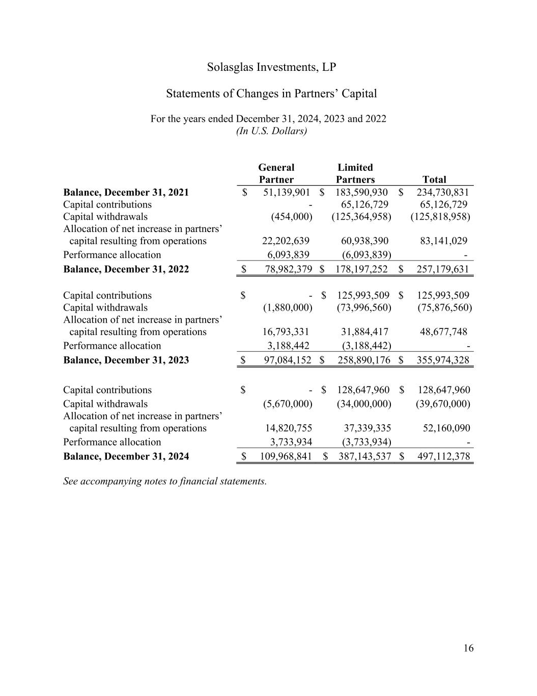 Solasglas Investments, LP Statements of Changes in Partners’ Capital For the years ended December 31, 2024, 2023 and 2022 (In U.S. Dollars) 16 General Partner Limited Partners Total Balance, December 31, 2021 $ 51,139,901 $ 183,590,930 $ 234,730,831 Capital contributions - 65,126,729 65,126,729 Capital withdrawals (454,000) (125,364,958) (125,818,958) Allocation of net increase in partners’ capital resulting from operations 22,202,639 60,938,390 83,141,029 Performance allocation 6,093,839 (6,093,839) - Balance, December 31, 2022 $ 78,982,379 $ 178,197,252 $ 257,179,631 Capital contributions $ - $ 125,993,509 $ 125,993,509 Capital withdrawals (1,880,000) (73,996,560) (75,876,560) Allocation of net increase in partners’ capital resulting from operations 16,793,331 31,884,417 48,677,748 Performance allocation 3,188,442 (3,188,442) - Balance, December 31, 2023 $ 97,084,152 $ 258,890,176 $ 355,974,328 Capital contributions $ - $ 128,647,960 $ 128,647,960 Capital withdrawals (5,670,000) (34,000,000) (39,670,000) Allocation of net increase in partners’ capital resulting from operations 14,820,755 37,339,335 52,160,090 Performance allocation 3,733,934 (3,733,934) - Balance, December 31, 2024 $ 109,968,841 $ 387,143,537 $ 497,112,378 See accompanying notes to financial statements.