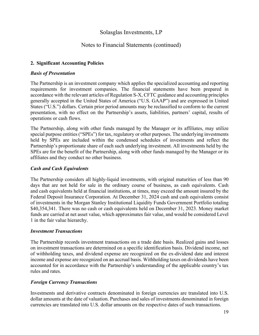 Solasglas Investments, LP Notes to Financial Statements (continued) 19 2. Significant Accounting Policies Basis of Presentation The Partnership is an investment company which applies the specialized accounting and reporting requirements for investment companies. The financial statements have been prepared in accordance with the relevant articles of Regulation S-X, CFTC guidance and accounting principles generally accepted in the United States of America (“U.S. GAAP”) and are expressed in United States (“U.S.”) dollars. Certain prior period amounts may be reclassified to conform to the current presentation, with no effect on the Partnership’s assets, liabilities, partners’ capital, results of operations or cash flows. The Partnership, along with other funds managed by the Manager or its affiliates, may utilize special purpose entities (“SPEs”) for tax, regulatory or other purposes. The underlying investments held by SPEs are included within the condensed schedules of investments and reflect the Partnership’s proportionate share of each such underlying investment. All investments held by the SPEs are for the benefit of the Partnership, along with other funds managed by the Manager or its affiliates and they conduct no other business. Cash and Cash Equivalents The Partnership considers all highly-liquid investments, with original maturities of less than 90 days that are not held for sale in the ordinary course of business, as cash equivalents. Cash and cash equivalents held at financial institutions, at times, may exceed the amount insured by the Federal Deposit Insurance Corporation. At December 31, 2024 cash and cash equivalents consist of investments in the Morgan Stanley Institutional Liquidity Funds Government Portfolio totaling $40,354,341. There was no cash or cash equivalents held on December 31, 2023. Money market funds are carried at net asset value, which approximates fair value, and would be considered Level 1 in the fair value hierarchy. Investment Transactions The Partnership records investment transactions on a trade date basis. Realized gains and losses on investment transactions are determined on a specific identification basis. Dividend income, net of withholding taxes, and dividend expense are recognized on the ex-dividend date and interest income and expense are recognized on an accrual basis. Withholding taxes on dividends have been accounted for in accordance with the Partnership’s understanding of the applicable country’s tax rules and rates. Foreign Currency Transactions Investments and derivative contracts denominated in foreign currencies are translated into U.S. dollar amounts at the date of valuation. Purchases and sales of investments denominated in foreign currencies are translated into U.S. dollar amounts on the respective dates of such transactions.