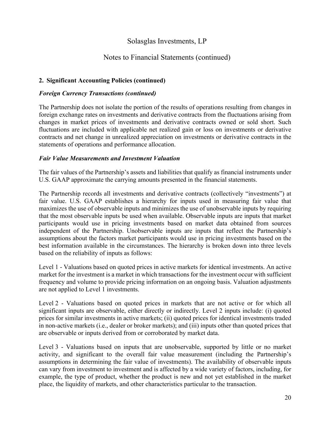 Solasglas Investments, LP Notes to Financial Statements (continued) 20 2. Significant Accounting Policies (continued) Foreign Currency Transactions (continued) The Partnership does not isolate the portion of the results of operations resulting from changes in foreign exchange rates on investments and derivative contracts from the fluctuations arising from changes in market prices of investments and derivative contracts owned or sold short. Such fluctuations are included with applicable net realized gain or loss on investments or derivative contracts and net change in unrealized appreciation on investments or derivative contracts in the statements of operations and performance allocation. Fair Value Measurements and Investment Valuation The fair values of the Partnership’s assets and liabilities that qualify as financial instruments under U.S. GAAP approximate the carrying amounts presented in the financial statements. The Partnership records all investments and derivative contracts (collectively “investments”) at fair value. U.S. GAAP establishes a hierarchy for inputs used in measuring fair value that maximizes the use of observable inputs and minimizes the use of unobservable inputs by requiring that the most observable inputs be used when available. Observable inputs are inputs that market participants would use in pricing investments based on market data obtained from sources independent of the Partnership. Unobservable inputs are inputs that reflect the Partnership’s assumptions about the factors market participants would use in pricing investments based on the best information available in the circumstances. The hierarchy is broken down into three levels based on the reliability of inputs as follows: Level 1 - Valuations based on quoted prices in active markets for identical investments. An active market for the investment is a market in which transactions for the investment occur with sufficient frequency and volume to provide pricing information on an ongoing basis. Valuation adjustments are not applied to Level 1 investments. Level 2 - Valuations based on quoted prices in markets that are not active or for which all significant inputs are observable, either directly or indirectly. Level 2 inputs include: (i) quoted prices for similar investments in active markets; (ii) quoted prices for identical investments traded in non-active markets (i.e., dealer or broker markets); and (iii) inputs other than quoted prices that are observable or inputs derived from or corroborated by market data. Level 3 - Valuations based on inputs that are unobservable, supported by little or no market activity, and significant to the overall fair value measurement (including the Partnership’s assumptions in determining the fair value of investments). The availability of observable inputs can vary from investment to investment and is affected by a wide variety of factors, including, for example, the type of product, whether the product is new and not yet established in the market place, the liquidity of markets, and other characteristics particular to the transaction.