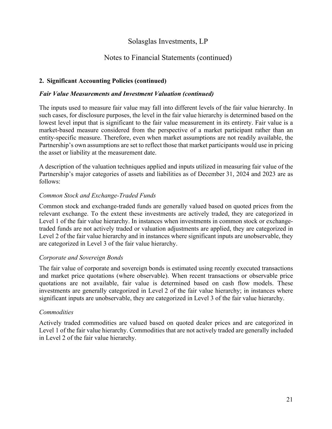 Solasglas Investments, LP Notes to Financial Statements (continued) 21 2. Significant Accounting Policies (continued) Fair Value Measurements and Investment Valuation (continued) The inputs used to measure fair value may fall into different levels of the fair value hierarchy. In such cases, for disclosure purposes, the level in the fair value hierarchy is determined based on the lowest level input that is significant to the fair value measurement in its entirety. Fair value is a market-based measure considered from the perspective of a market participant rather than an entity-specific measure. Therefore, even when market assumptions are not readily available, the Partnership’s own assumptions are set to reflect those that market participants would use in pricing the asset or liability at the measurement date. A description of the valuation techniques applied and inputs utilized in measuring fair value of the Partnership’s major categories of assets and liabilities as of December 31, 2024 and 2023 are as follows: Common Stock and Exchange-Traded Funds Common stock and exchange-traded funds are generally valued based on quoted prices from the relevant exchange. To the extent these investments are actively traded, they are categorized in Level 1 of the fair value hierarchy. In instances when investments in common stock or exchange- traded funds are not actively traded or valuation adjustments are applied, they are categorized in Level 2 of the fair value hierarchy and in instances where significant inputs are unobservable, they are categorized in Level 3 of the fair value hierarchy. Corporate and Sovereign Bonds The fair value of corporate and sovereign bonds is estimated using recently executed transactions and market price quotations (where observable). When recent transactions or observable price quotations are not available, fair value is determined based on cash flow models. These investments are generally categorized in Level 2 of the fair value hierarchy; in instances where significant inputs are unobservable, they are categorized in Level 3 of the fair value hierarchy. Commodities Actively traded commodities are valued based on quoted dealer prices and are categorized in Level 1 of the fair value hierarchy. Commodities that are not actively traded are generally included in Level 2 of the fair value hierarchy.