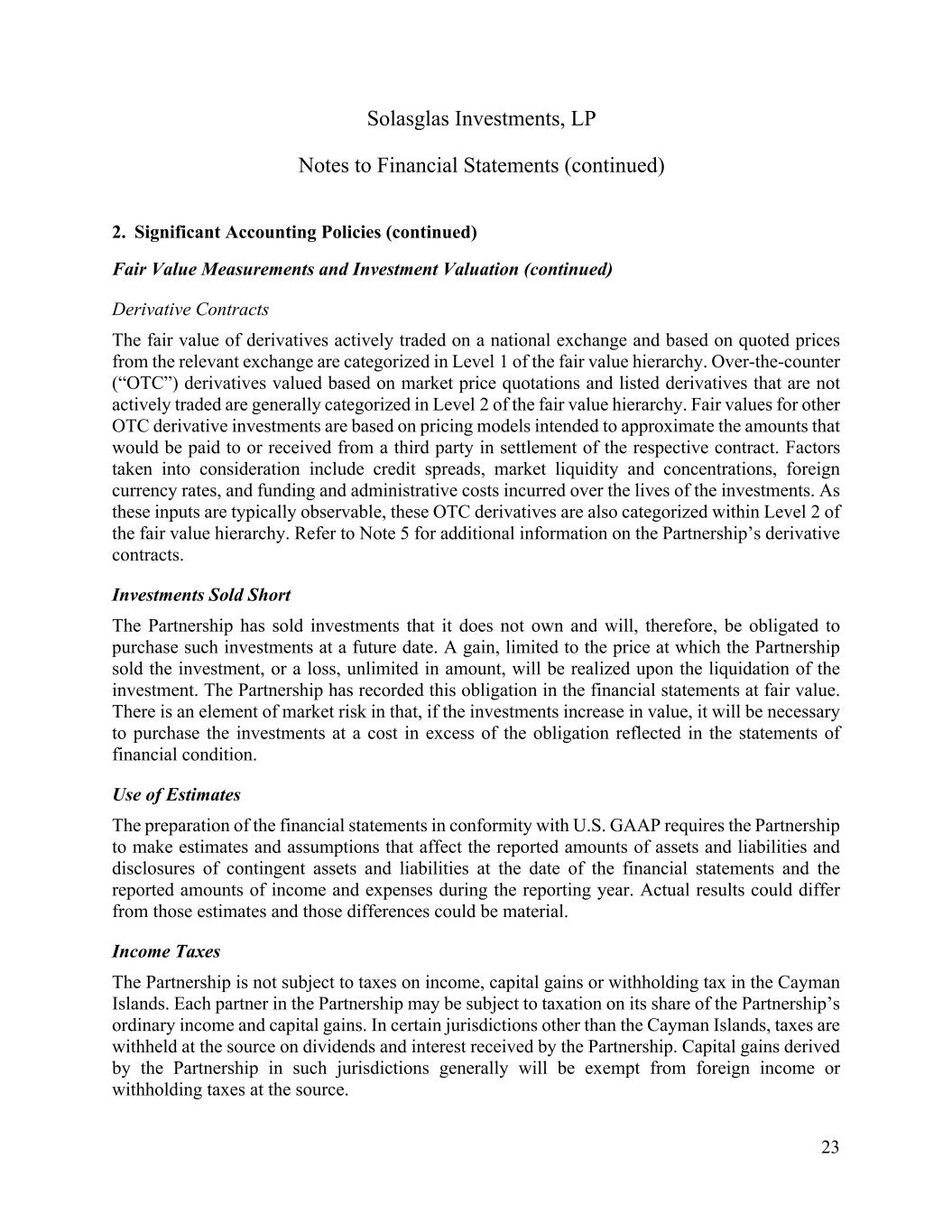 Solasglas Investments, LP Notes to Financial Statements (continued) 23 2. Significant Accounting Policies (continued) Fair Value Measurements and Investment Valuation (continued) Derivative Contracts The fair value of derivatives actively traded on a national exchange and based on quoted prices from the relevant exchange are categorized in Level 1 of the fair value hierarchy. Over-the-counter (“OTC”) derivatives valued based on market price quotations and listed derivatives that are not actively traded are generally categorized in Level 2 of the fair value hierarchy. Fair values for other OTC derivative investments are based on pricing models intended to approximate the amounts that would be paid to or received from a third party in settlement of the respective contract. Factors taken into consideration include credit spreads, market liquidity and concentrations, foreign currency rates, and funding and administrative costs incurred over the lives of the investments. As these inputs are typically observable, these OTC derivatives are also categorized within Level 2 of the fair value hierarchy. Refer to Note 5 for additional information on the Partnership’s derivative contracts. Investments Sold Short The Partnership has sold investments that it does not own and will, therefore, be obligated to purchase such investments at a future date. A gain, limited to the price at which the Partnership sold the investment, or a loss, unlimited in amount, will be realized upon the liquidation of the investment. The Partnership has recorded this obligation in the financial statements at fair value. There is an element of market risk in that, if the investments increase in value, it will be necessary to purchase the investments at a cost in excess of the obligation reflected in the statements of financial condition. Use of Estimates The preparation of the financial statements in conformity with U.S. GAAP requires the Partnership to make estimates and assumptions that affect the reported amounts of assets and liabilities and disclosures of contingent assets and liabilities at the date of the financial statements and the reported amounts of income and expenses during the reporting year. Actual results could differ from those estimates and those differences could be material. Income Taxes The Partnership is not subject to taxes on income, capital gains or withholding tax in the Cayman Islands. Each partner in the Partnership may be subject to taxation on its share of the Partnership’s ordinary income and capital gains. In certain jurisdictions other than the Cayman Islands, taxes are withheld at the source on dividends and interest received by the Partnership. Capital gains derived by the Partnership in such jurisdictions generally will be exempt from foreign income or withholding taxes at the source.