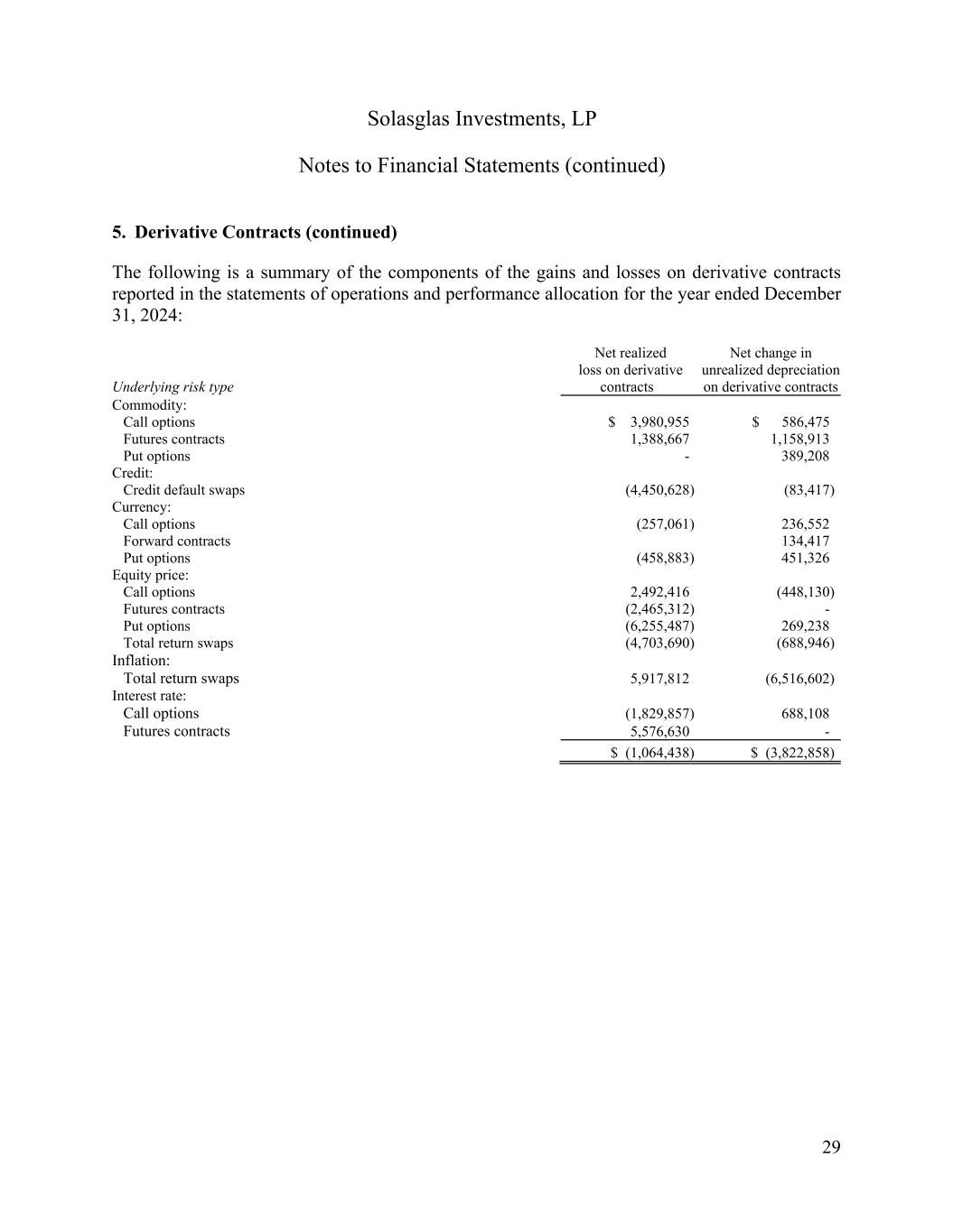 Solasglas Investments, LP Notes to Financial Statements (continued) 29 5. Derivative Contracts (continued) The following is a summary of the components of the gains and losses on derivative contracts reported in the statements of operations and performance allocation for the year ended December 31, 2024: Underlying risk type Net realized loss on derivative contracts Net change in unrealized depreciation on derivative contracts Commodity: Call options $ 3,980,955 $ 586,475 Futures contracts 1,388,667 1,158,913 Put options - 389,208 Credit: Credit default swaps (4,450,628) (83,417) Currency: Call options (257,061) 236,552 Forward contracts 134,417 Put options (458,883) 451,326 Equity price: Call options 2,492,416 (448,130) Futures contracts (2,465,312) - Put options (6,255,487) 269,238 Total return swaps (4,703,690) (688,946) Inflation: Total return swaps 5,917,812 (6,516,602) Interest rate: Call options (1,829,857) 688,108 Futures contracts 5,576,630 - $ (1,064,438) $ (3,822,858)