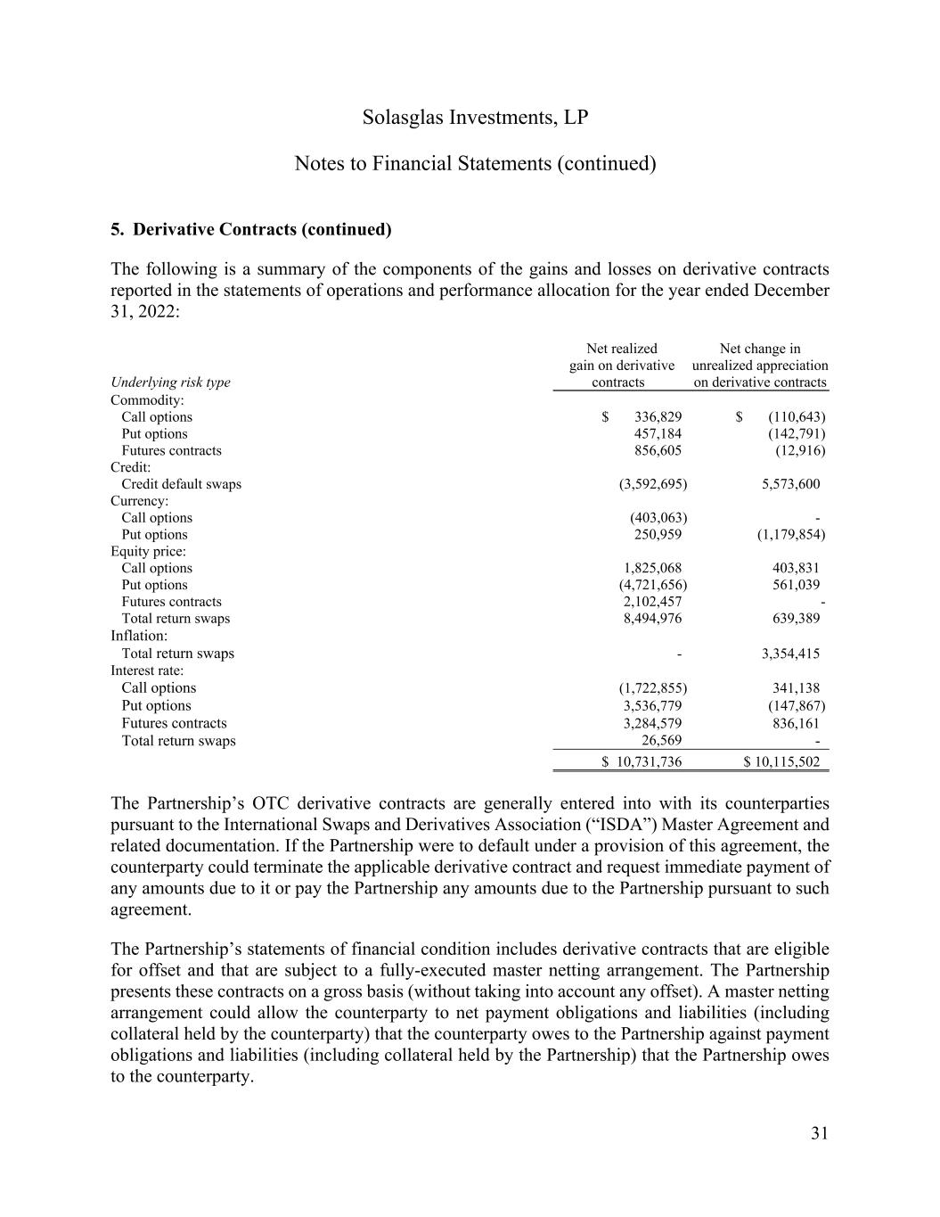 Solasglas Investments, LP Notes to Financial Statements (continued) 30 5. Derivative Contracts (continued) The following is a summary of the components of the gains and losses on derivative contracts reported in the statements of operations and performance allocation for the year ended December 31, 2023: Underlying risk type Net realized gain on derivative contracts Net change in unrealized appreciation on derivative contracts Commodity: Call options $ (1,129,361) $ (1,562,527) Futures contracts (2,207,174) (1,300,928) Credit: Credit default swaps (3,267,350) (4,474,333) Currency: Call options 126,130 (236,550) Put options (1,256,374) 728,528 Equity price: Call options 1,319,340 (252,974) Futures contracts (1,571,652) - Put options (3,619,893) (103,529) Total return swaps (3,079,100) (1,033,640) Inflation: Total return swaps (221,908) 1,604,415 Interest rate: Call options 13,399,028 (1,029,246) Put options 1,303,770 147,867 Futures contracts 4,081,551 (836,993) $ 3,877,007 $ (8,349,910)