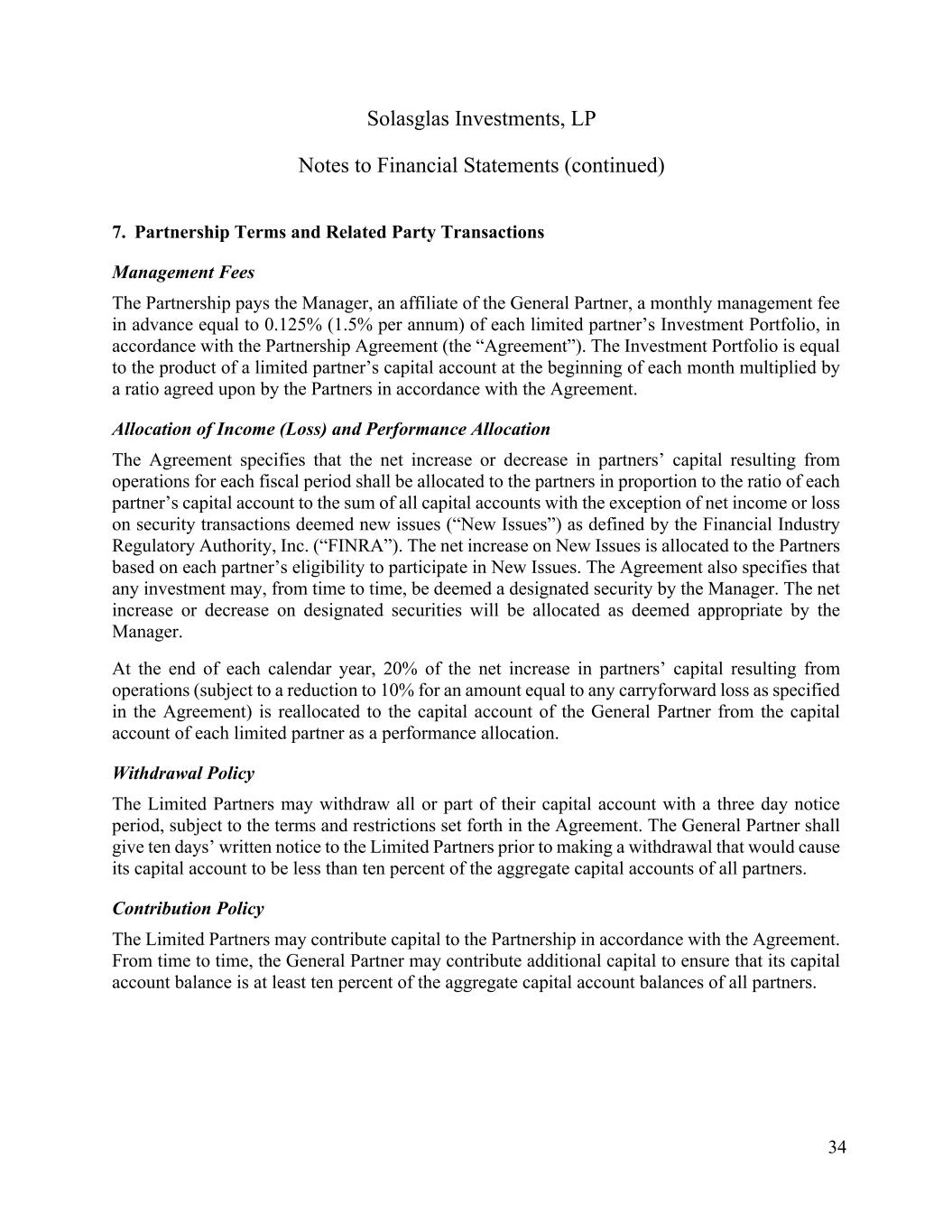 Solasglas Investments, LP Notes to Financial Statements (continued) 34 7. Partnership Terms and Related Party Transactions Management Fees The Partnership pays the Manager, an affiliate of the General Partner, a monthly management fee in advance equal to 0.125% (1.5% per annum) of each limited partner’s Investment Portfolio, in accordance with the Partnership Agreement (the “Agreement”). The Investment Portfolio is equal to the product of a limited partner’s capital account at the beginning of each month multiplied by a ratio agreed upon by the Partners in accordance with the Agreement. Allocation of Income (Loss) and Performance Allocation The Agreement specifies that the net increase or decrease in partners’ capital resulting from operations for each fiscal period shall be allocated to the partners in proportion to the ratio of each partner’s capital account to the sum of all capital accounts with the exception of net income or loss on security transactions deemed new issues (“New Issues”) as defined by the Financial Industry Regulatory Authority, Inc. (“FINRA”). The net increase on New Issues is allocated to the Partners based on each partner’s eligibility to participate in New Issues. The Agreement also specifies that any investment may, from time to time, be deemed a designated security by the Manager. The net increase or decrease on designated securities will be allocated as deemed appropriate by the Manager. At the end of each calendar year, 20% of the net increase in partners’ capital resulting from operations (subject to a reduction to 10% for an amount equal to any carryforward loss as specified in the Agreement) is reallocated to the capital account of the General Partner from the capital account of each limited partner as a performance allocation. Withdrawal Policy The Limited Partners may withdraw all or part of their capital account with a three day notice period, subject to the terms and restrictions set forth in the Agreement. The General Partner shall give ten days’ written notice to the Limited Partners prior to making a withdrawal that would cause its capital account to be less than ten percent of the aggregate capital accounts of all partners. Contribution Policy The Limited Partners may contribute capital to the Partnership in accordance with the Agreement. From time to time, the General Partner may contribute additional capital to ensure that its capital account balance is at least ten percent of the aggregate capital account balances of all partners.