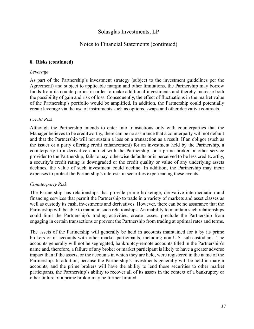 Solasglas Investments, LP Notes to Financial Statements (continued) 37 8. Risks (continued) Leverage As part of the Partnership’s investment strategy (subject to the investment guidelines per the Agreement) and subject to applicable margin and other limitations, the Partnership may borrow funds from its counterparties in order to make additional investments and thereby increase both the possibility of gain and risk of loss. Consequently, the effect of fluctuations in the market value of the Partnership’s portfolio would be amplified. In addition, the Partnership could potentially create leverage via the use of instruments such as options, swaps and other derivative contracts. Credit Risk Although the Partnership intends to enter into transactions only with counterparties that the Manager believes to be creditworthy, there can be no assurance that a counterparty will not default and that the Partnership will not sustain a loss on a transaction as a result. If an obligor (such as the issuer or a party offering credit enhancement) for an investment held by the Partnership, a counterparty to a derivative contract with the Partnership, or a prime broker or other service provider to the Partnership, fails to pay, otherwise defaults or is perceived to be less creditworthy, a security’s credit rating is downgraded or the credit quality or value of any underlying assets declines, the value of such investment could decline. In addition, the Partnership may incur expenses to protect the Partnership’s interests in securities experiencing these events. Counterparty Risk The Partnership has relationships that provide prime brokerage, derivative intermediation and financing services that permit the Partnership to trade in a variety of markets and asset classes as well as custody its cash, investments and derivatives. However, there can be no assurance that the Partnership will be able to maintain such relationships. An inability to maintain such relationships could limit the Partnership’s trading activities, create losses, preclude the Partnership from engaging in certain transactions or prevent the Partnership from trading at optimal rates and terms. The assets of the Partnership will generally be held in accounts maintained for it by its prime brokers or in accounts with other market participants, including non-U.S. sub-custodians. The accounts generally will not be segregated, bankruptcy-remote accounts titled in the Partnership’s name and, therefore, a failure of any broker or market participant is likely to have a greater adverse impact than if the assets, or the accounts in which they are held, were registered in the name of the Partnership. In addition, because the Partnership’s investments generally will be held in margin accounts, and the prime brokers will have the ability to lend those securities to other market participants, the Partnership’s ability to recover all of its assets in the context of a bankruptcy or other failure of a prime broker may be further limited.