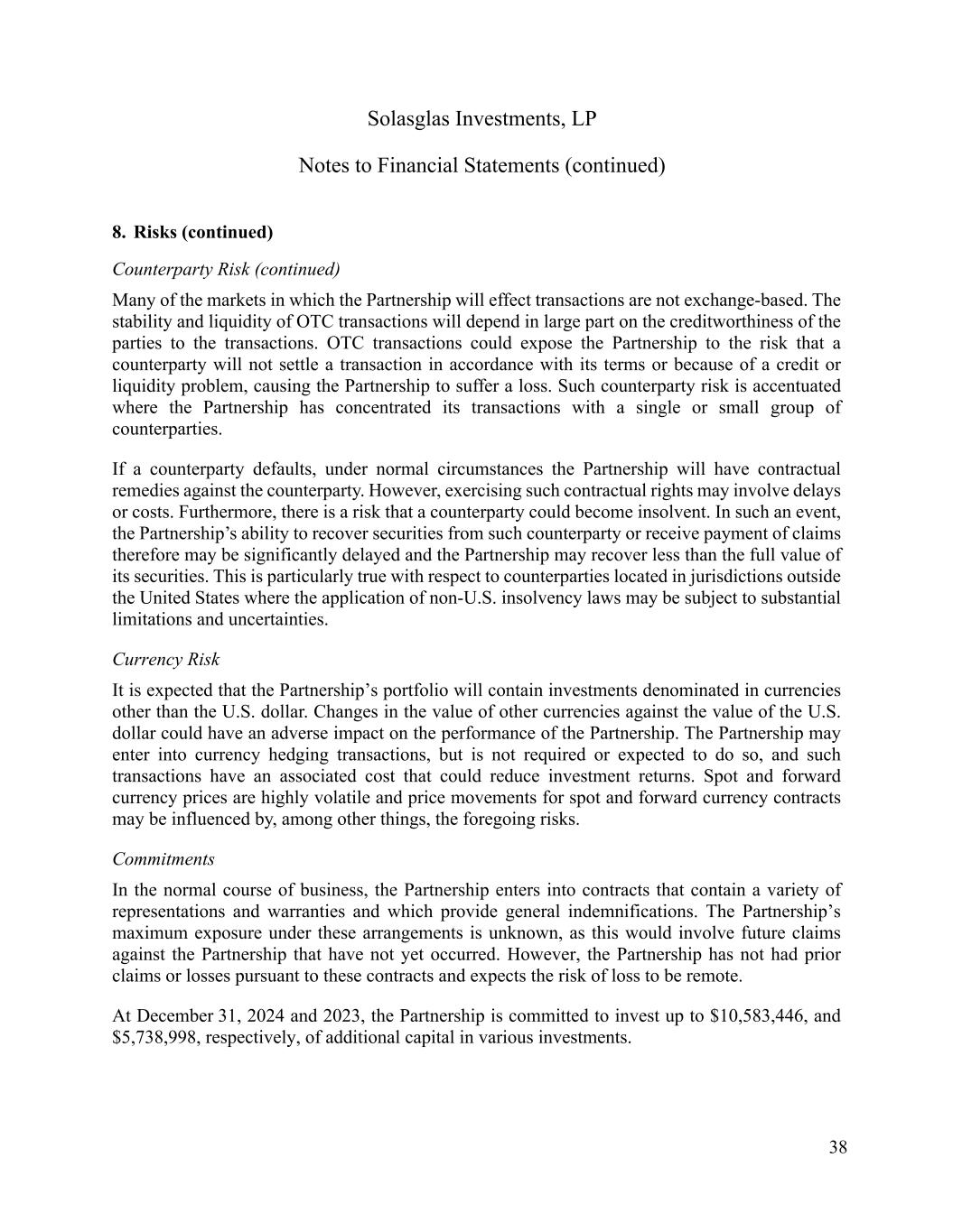 Solasglas Investments, LP Notes to Financial Statements (continued) 38 8. Risks (continued) Counterparty Risk (continued) Many of the markets in which the Partnership will effect transactions are not exchange-based. The stability and liquidity of OTC transactions will depend in large part on the creditworthiness of the parties to the transactions. OTC transactions could expose the Partnership to the risk that a counterparty will not settle a transaction in accordance with its terms or because of a credit or liquidity problem, causing the Partnership to suffer a loss. Such counterparty risk is accentuated where the Partnership has concentrated its transactions with a single or small group of counterparties. If a counterparty defaults, under normal circumstances the Partnership will have contractual remedies against the counterparty. However, exercising such contractual rights may involve delays or costs. Furthermore, there is a risk that a counterparty could become insolvent. In such an event, the Partnership’s ability to recover securities from such counterparty or receive payment of claims therefore may be significantly delayed and the Partnership may recover less than the full value of its securities. This is particularly true with respect to counterparties located in jurisdictions outside the United States where the application of non-U.S. insolvency laws may be subject to substantial limitations and uncertainties. Currency Risk It is expected that the Partnership’s portfolio will contain investments denominated in currencies other than the U.S. dollar. Changes in the value of other currencies against the value of the U.S. dollar could have an adverse impact on the performance of the Partnership. The Partnership may enter into currency hedging transactions, but is not required or expected to do so, and such transactions have an associated cost that could reduce investment returns. Spot and forward currency prices are highly volatile and price movements for spot and forward currency contracts may be influenced by, among other things, the foregoing risks. Commitments In the normal course of business, the Partnership enters into contracts that contain a variety of representations and warranties and which provide general indemnifications. The Partnership’s maximum exposure under these arrangements is unknown, as this would involve future claims against the Partnership that have not yet occurred. However, the Partnership has not had prior claims or losses pursuant to these contracts and expects the risk of loss to be remote. At December 31, 2024 and 2023, the Partnership is committed to invest up to $10,583,446, and $5,738,998, respectively, of additional capital in various investments.