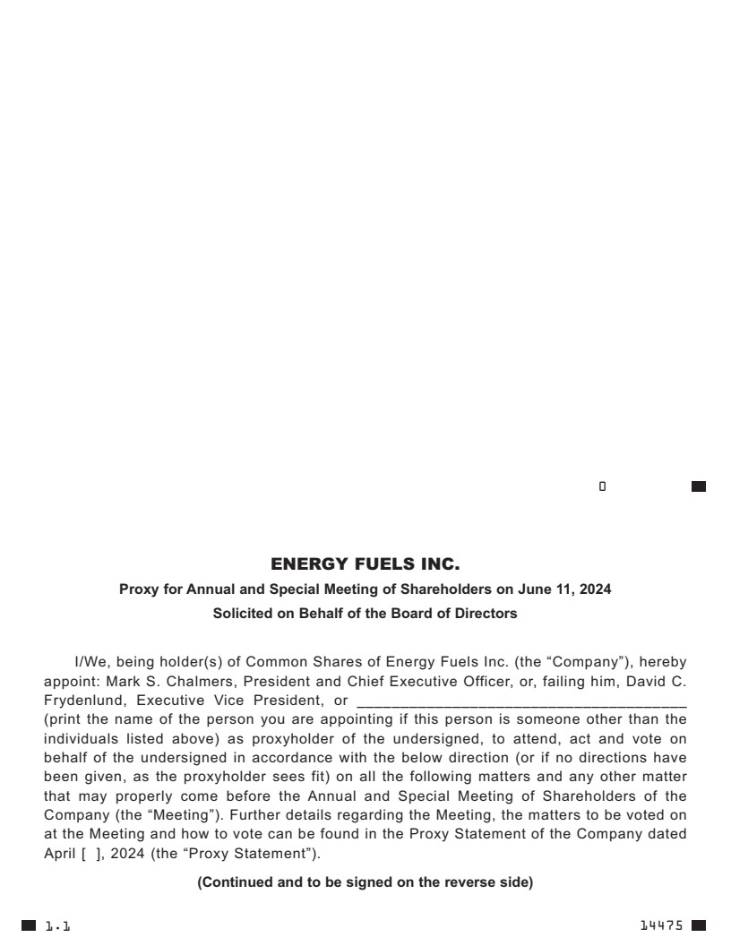 The information contained in this Proxy Statement ("Proxy Statement") is furnished in connection with the solicitation of proxies by and on behalf of management of Energy Fuels Inc. (the "Company") to be used at the annual and special meeting of shareholders of the Company to be held by way of a live audio webcast through the Lumi/Equiniti Virtual AGM platform (the "Virtual Platform") at https://web.lumiconnect.com/255057223, password "ef2024" (case-sensitive), on Tuesday, June 11, 2024 at 10:00 a.m. (MDT) (the "Meeting"), and at all adjournments thereof, for the purposes set forth in the accompanying Notice of Meeting.