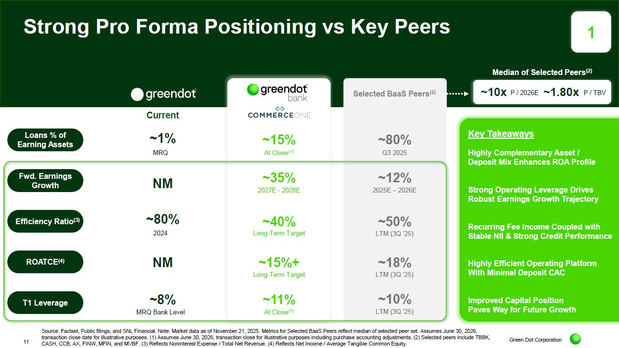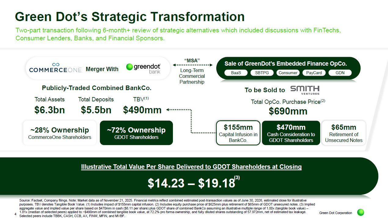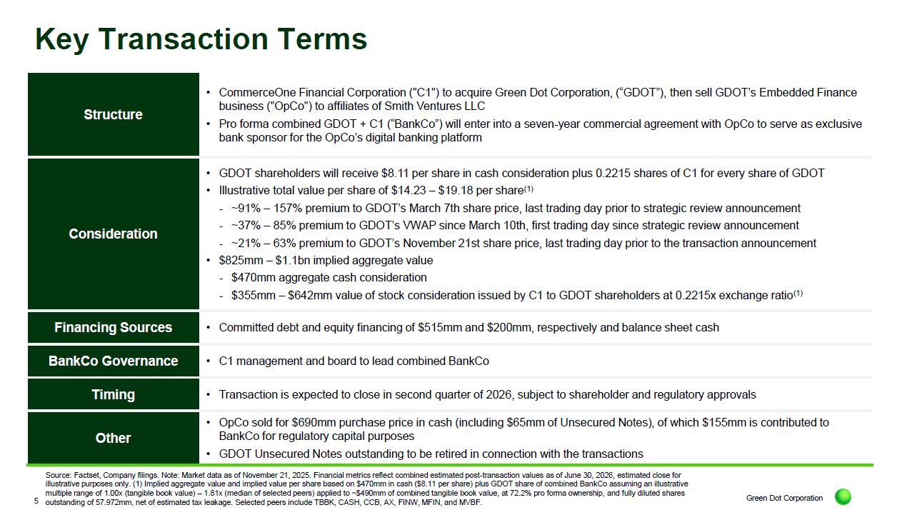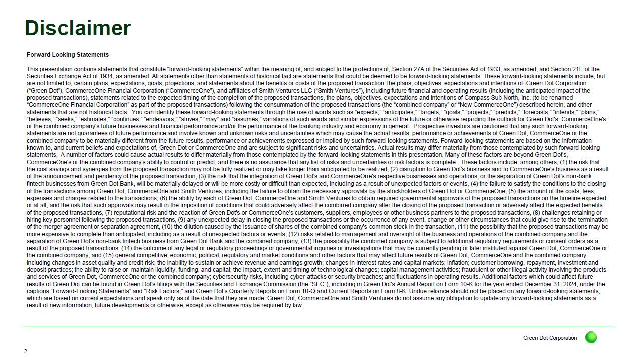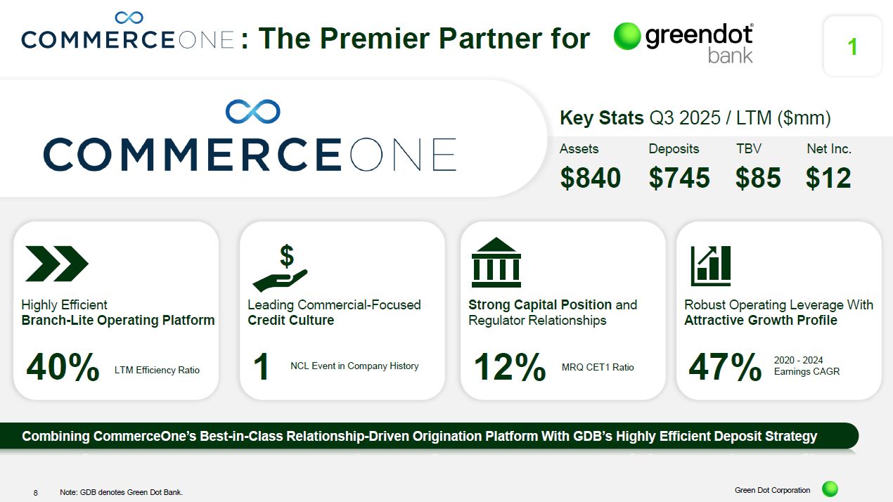 Investor presentation of Green Dot Corporation, CommerceOne Financial Corporation and Smith Ventures LLC, dated November 24, 2025.