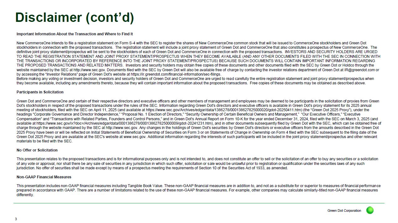 In connection with the announcement of the Merger Agreement and Separation Agreement, Green Dot, CommerceOne and Smith Ventures intend to provide supplemental information