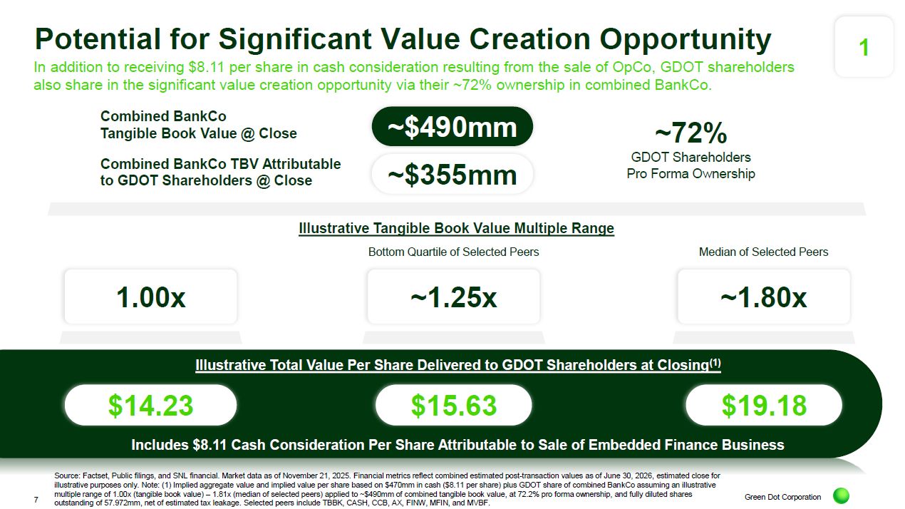 $8.11 Cash Consideration Per Share Attributable to Sale of Embedded Finance Business 1 Combined BankCo Tangible Book Value @ Close Combined BankCo TBV Attributable to GDOT Shareholders @ Close ~72% GDOT Shareholders Pro Forma