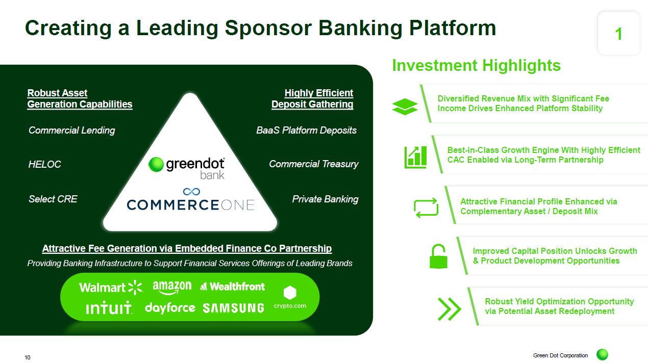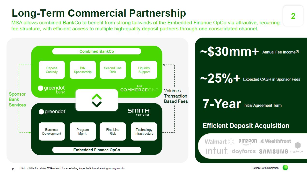 Green Dot Corporation Sponsor Bank Services Long-Term Commercial Partnership MSA allows combined BankCo to benefit from