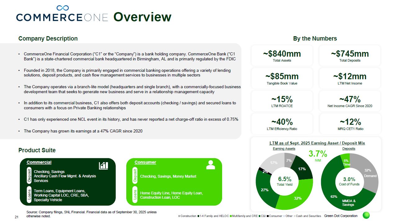 On November 24, 2025, Green Dot Corporation, a Delaware corporation (“Green Dot”), CommerceOne Financial Corporation, an Alabama corporation (“CommerceOne”), and
