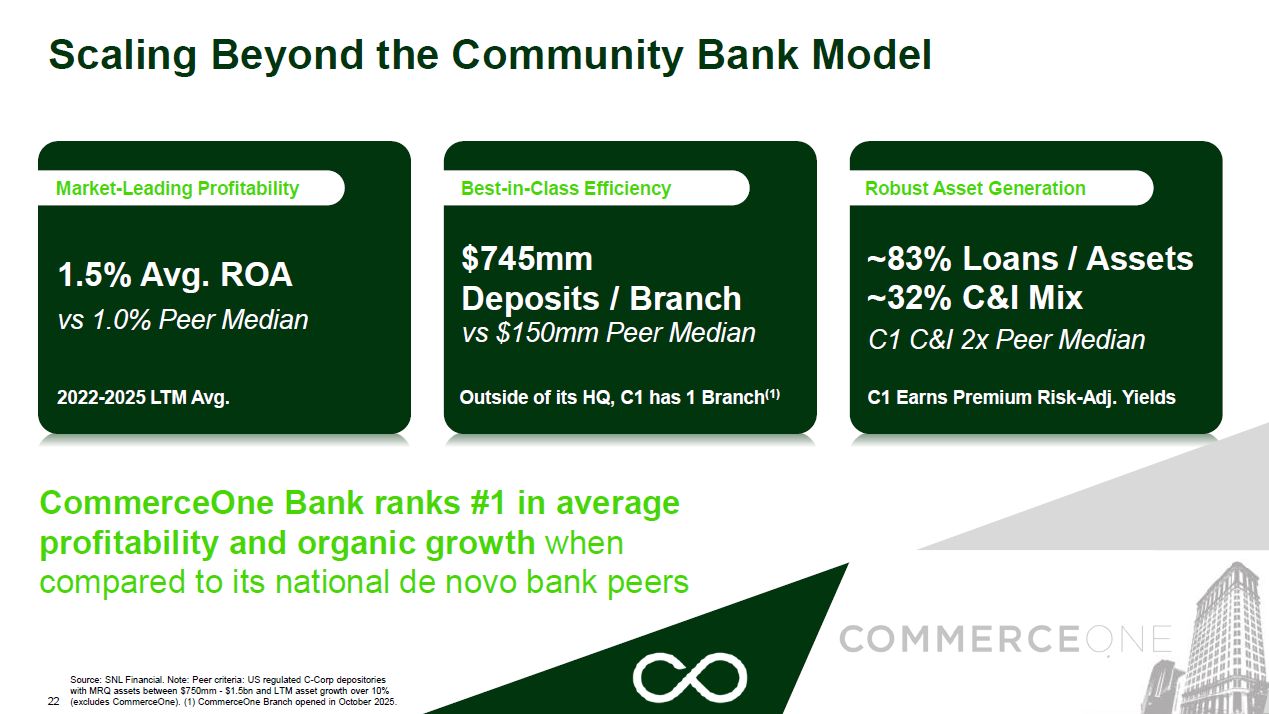 Median 2022-2025 LTM Avg. Outside of its HQ, C1 has 1 Branch(1) ~83% Loans / Assets ~32% C&I Mix C1 C&I 2x Peer Median C1 Earns Premium Risk-Adj. Yields Source: SNL Financial. Note: Peer criteria: US regulated C-Corp
