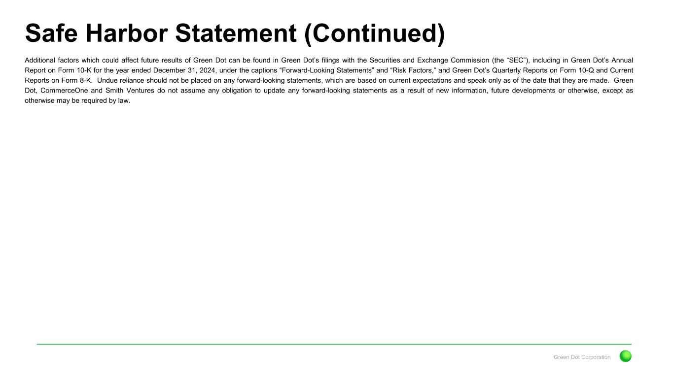 Green Dot Corporation Safe Harbor Statement (Continued) Additional factors which could affect future results of Green Dot can be found in Green Dot’s filings with the Securities and Exchange Commission (the “SEC”), including in Green Dot’s Annual Report on Form 10-K for the year ended December 31, 2024, under the captions “Forward-Looking Statements” and “Risk Factors,” and Green Dot’s Quarterly Reports on Form 10-Q and Current Reports on Form 8-K. Undue reliance should not be placed on any forward-looking statements, which are based on current expectations and speak only as of the date that they are made. Green Dot, CommerceOne and Smith Ventures do not assume any obligation to update any forward-looking statements as a result of new information, future developments or otherwise, except as otherwise may be required by law.