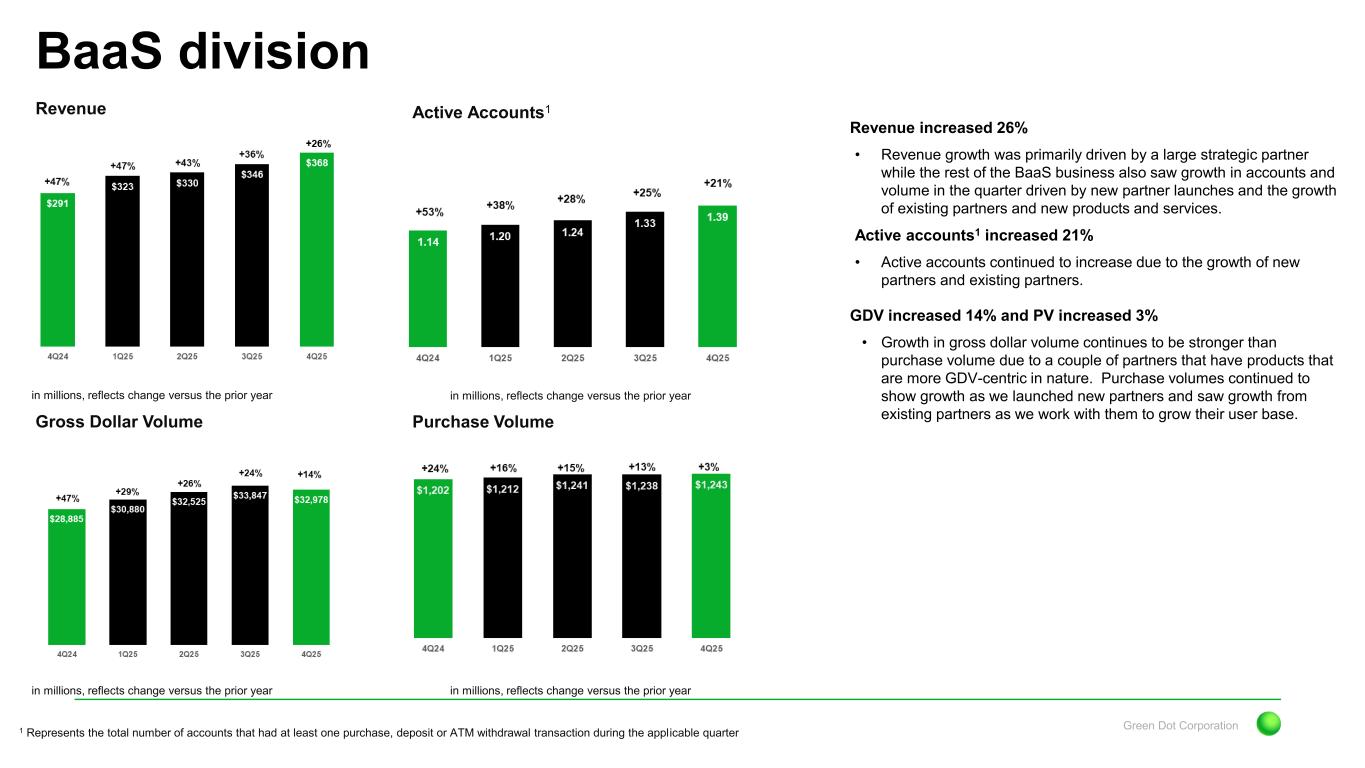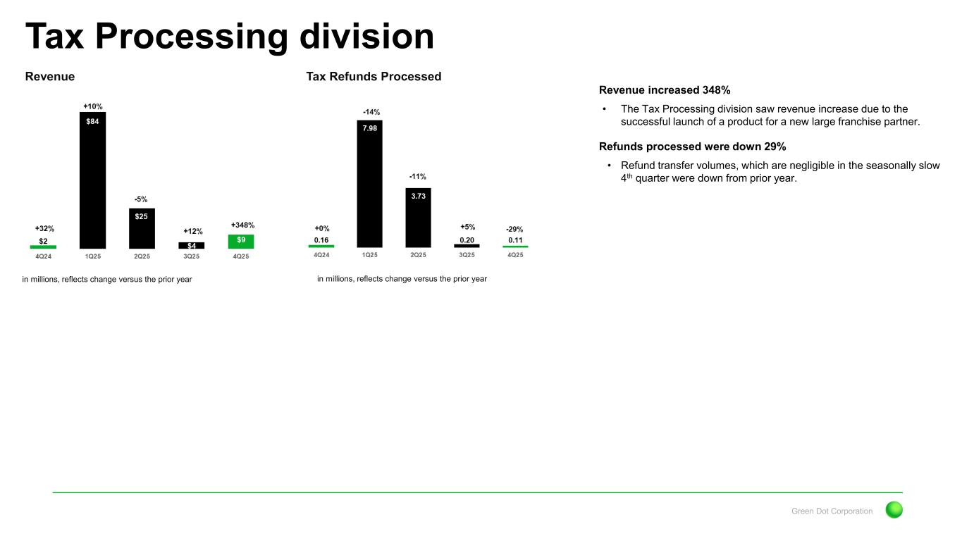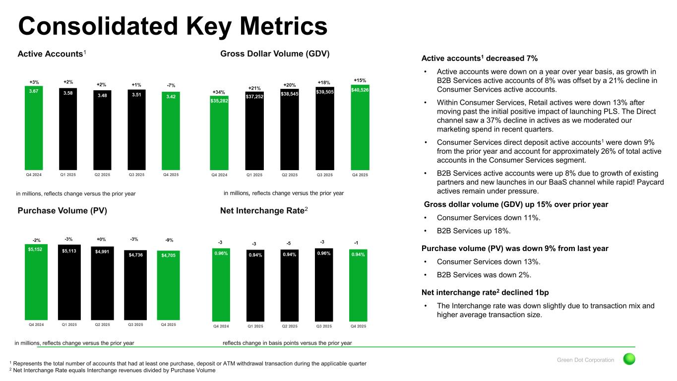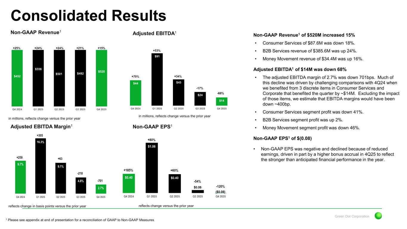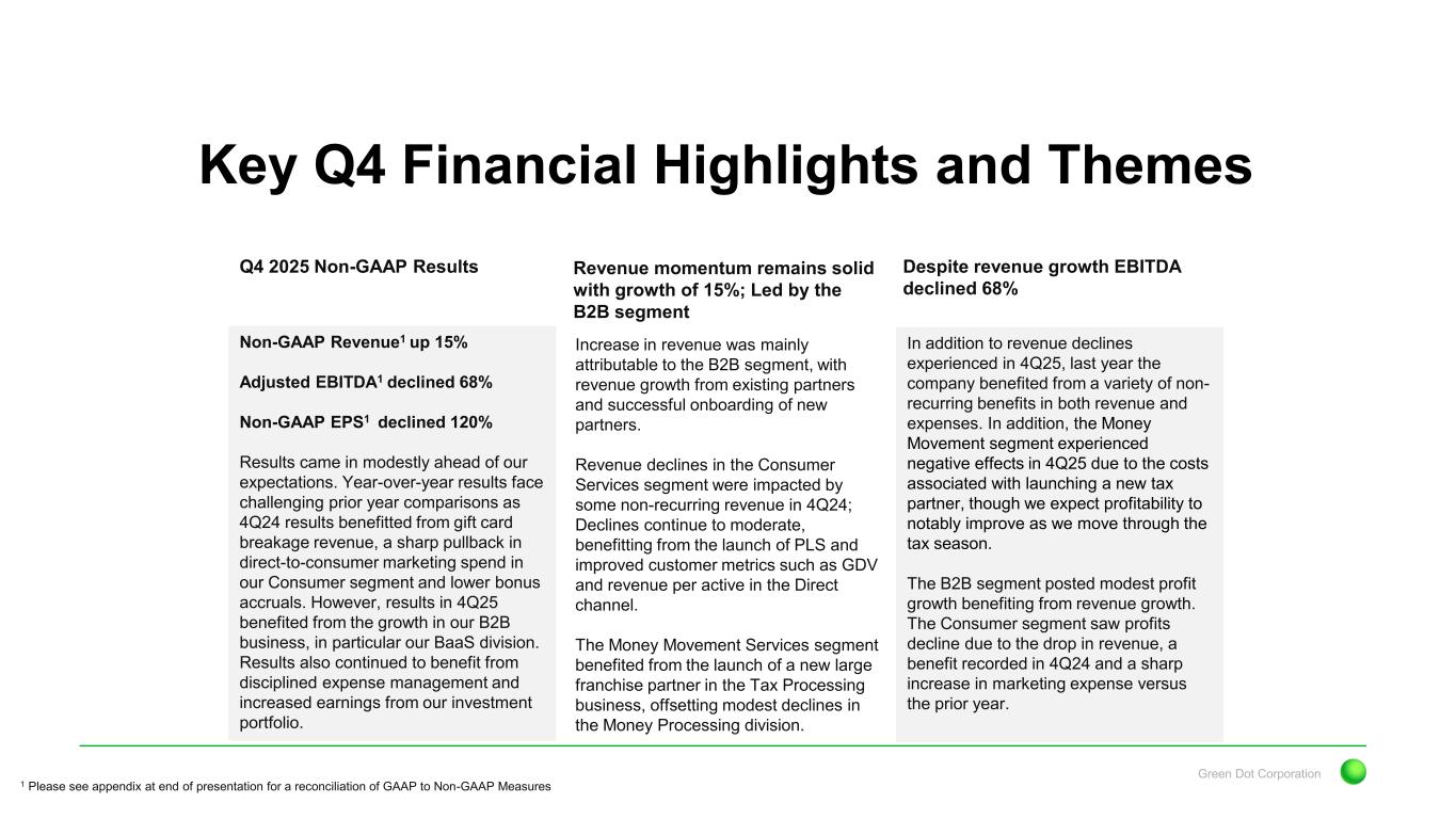 Green Dot Corporation Revenue momentum remains solid with growth of 15%; Led by the B2B segment Key Q4 Financial Highlights and Themes Q4 2025 Non-GAAP Results Non-GAAP Revenue1 up 15% Adjusted EBITDA1 declined 68% Non-GAAP EPS1 declined 120% Results came in modestly ahead of our expectations. Year-over-year results face challenging prior year comparisons as 4Q24 results benefitted from gift card breakage revenue, a sharp pullback in direct-to-consumer marketing spend in our Consumer segment and lower bonus accruals. However, results in 4Q25 benefited from the growth in our B2B business, in particular our BaaS division. Results also continued to benefit from disciplined expense management and increased earnings from our investment portfolio. Despite revenue growth EBITDA declined 68% In addition to revenue declines experienced in 4Q25, last year the company benefited from a variety of non- recurring benefits in both revenue and expenses. In addition, the Money Movement segment experienced negative effects in 4Q25 due to the costs associated with launching a new tax partner, though we expect profitability to notably improve as we move through the tax season. The B2B segment posted modest profit growth benefiting from revenue growth. The Consumer segment saw profits decline due to the drop in revenue, a benefit recorded in 4Q24 and a sharp increase in marketing expense versus the prior year. 1 Please see appendix at end of presentation for a reconciliation of GAAP to Non-GAAP Measures Increase in revenue was mainly attributable to the B2B segment, with revenue growth from existing partners and successful onboarding of new partners. Revenue declines in the Consumer Services segment were impacted by some non-recurring revenue in 4Q24; Declines continue to moderate, benefitting from the launch of PLS and improved customer metrics such as GDV and revenue per active in the Direct channel. The Money Movement Services segment benefited from the launch of a new large franchise partner in the Tax Processing business, offsetting modest declines in the Money Processing division.