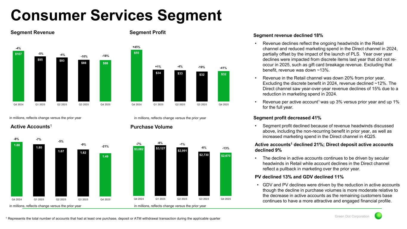 Green Dot Corporation Segment Revenue Consumer Services Segment Segment Profit Active Accounts1 Purchase Volume in millions, reflects change versus the prior year in millions, reflects change versus the prior year in millions, reflects change versus the prior year in millions, reflects change versus the prior year Segment revenue declined 18% • Revenue declines reflect the ongoing headwinds in the Retail channel and reduced marketing spend in the Direct channel in 2024, partially offset by the impact of the launch of PLS. Year over year declines were impacted from discrete items last year that did not re- occur in 2025, such as gift card breakage revenue. Excluding that benefit, revenue was down ~13%. • Revenue in the Retail channel was down 20% from prior year. Excluding the discrete benefit in 2024, revenue declined ~12%. The Direct channel saw year-over-year revenue declines of 15% due to a reduction in marketing spend in 2024. • Revenue per active account1 was up 3% versus prior year and up 1% for the full year. Segment profit decreased 41% • Segment profit declined because of revenue headwinds discussed above, including the non-recurring benefit in prior year, as well as increased marketing spend in the Direct channel in 4Q25. Active accounts1 declined 21%; Direct deposit active accounts declined 9% • The decline in active accounts continues to be driven by secular headwinds in Retail while account declines in the Direct channel reflect a pullback in marketing over the prior year. PV declined 13% and GDV declined 11% • GDV and PV declines were driven by the reduction in active accounts though the decline in purchase volumes is more moderate relative to the decrease in active accounts as the remaining customers base continues to have a more attractive and engaged financial profile. 1 Represents the total number of accounts that had at least one purchase, deposit or ATM withdrawal transaction during the applicable quarter