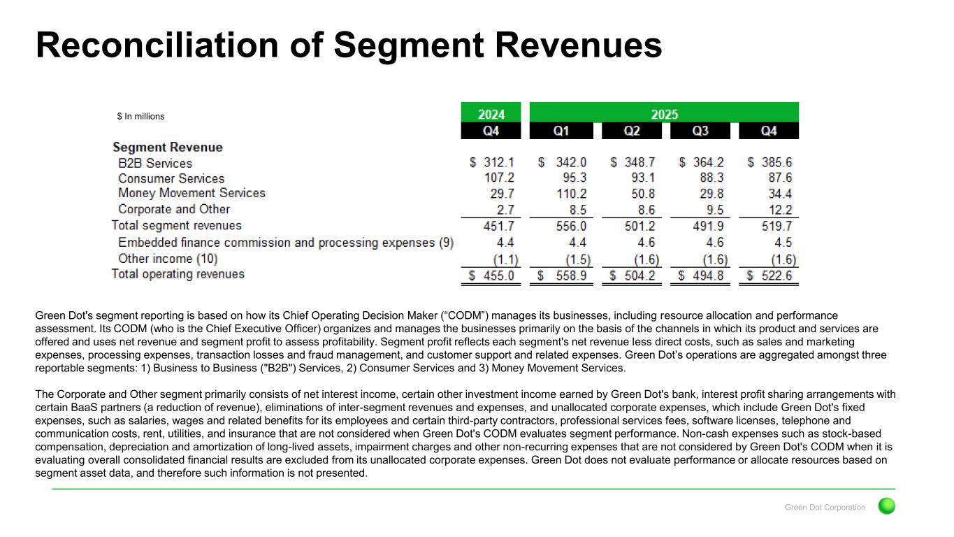 Green Dot Corporation Reconciliation of Segment Revenues Green Dot's segment reporting is based on how its Chief Operating Decision Maker (“CODM”) manages its businesses, including resource allocation and performance assessment. Its CODM (who is the Chief Executive Officer) organizes and manages the businesses primarily on the basis of the channels in which its product and services are offered and uses net revenue and segment profit to assess profitability. Segment profit reflects each segment's net revenue less direct costs, such as sales and marketing expenses, processing expenses, transaction losses and fraud management, and customer support and related expenses. Green Dot’s operations are aggregated amongst three reportable segments: 1) Business to Business ("B2B") Services, 2) Consumer Services and 3) Money Movement Services. The Corporate and Other segment primarily consists of net interest income, certain other investment income earned by Green Dot's bank, interest profit sharing arrangements with certain BaaS partners (a reduction of revenue), eliminations of inter-segment revenues and expenses, and unallocated corporate expenses, which include Green Dot's fixed expenses, such as salaries, wages and related benefits for its employees and certain third-party contractors, professional services fees, software licenses, telephone and communication costs, rent, utilities, and insurance that are not considered when Green Dot's CODM evaluates segment performance. Non-cash expenses such as stock-based compensation, depreciation and amortization of long-lived assets, impairment charges and other non-recurring expenses that are not considered by Green Dot's CODM when it is evaluating overall consolidated financial results are excluded from its unallocated corporate expenses. Green Dot does not evaluate performance or allocate resources based on segment asset data, and therefore such information is not presented. $ In millions