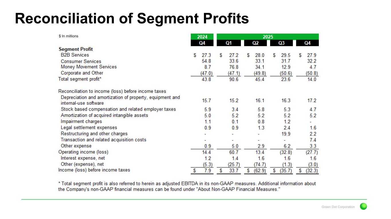 Green Dot Corporation Non-GAAP Revenue1 of $520M increased 15% • Consumer Services of $87.6M was down 18%. • B2B Services revenue of $385.6M was up 24%. • Money Movement revenue of $34.4M was up 16%. Adjusted EBITDA1 of $14M was down 68% • The adjusted EBITDA margin of 2.7% was down 701bps. Much of this decline was driven by challenging comparisons with 4Q24 when we benefited from 3 discrete items in Consumer Services and Corporate that benefited the quarter by ~$14M. Excluding the impact of those items, we estimate that EBITDA margins would have been down ~400bp. • Consumer Services segment profit was down 41%. • B2B Services segment profit was up 2%. • Money Movement segment profit was down 46%. Non-GAAP EPS1 of $(0.08) • Non-GAAP EPS was negative and declined because of reduced earnings, driven in part by a higher bonus accrual in 4Q25 to reflect the stronger than anticipated financial performance in the year. Non-GAAP Revenue1 Consolidated Results Adjusted EBITDA1 Adjusted EBITDA Margin1 Non-GAAP EPS1 in millions, reflects change versus the prior year in millions, reflects change versus the prior year reflects change in basis points versus the prior year reflects change versus the prior year 1 Please see appendix at end of presentation for a reconciliation of GAAP to Non-GAAP Measures