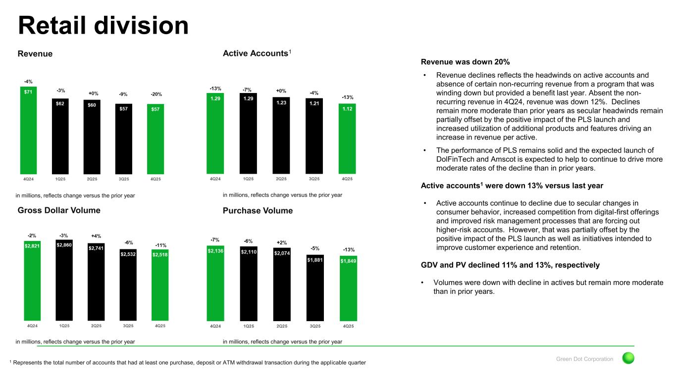 Green Dot Corporation Revenue Retail division Gross Dollar Volume Active Accounts1 Purchase Volume in millions, reflects change versus the prior year in millions, reflects change versus the prior year in millions, reflects change versus the prior year in millions, reflects change versus the prior year Revenue was down 20% • Revenue declines reflects the headwinds on active accounts and absence of certain non-recurring revenue from a program that was winding down but provided a benefit last year. Absent the non- recurring revenue in 4Q24, revenue was down 12%. Declines remain more moderate than prior years as secular headwinds remain partially offset by the positive impact of the PLS launch and increased utilization of additional products and features driving an increase in revenue per active. • The performance of PLS remains solid and the expected launch of DolFinTech and Amscot is expected to help to continue to drive more moderate rates of the decline than in prior years. Active accounts1 were down 13% versus last year • Active accounts continue to decline due to secular changes in consumer behavior, increased competition from digital-first offerings and improved risk management processes that are forcing out higher-risk accounts. However, that was partially offset by the positive impact of the PLS launch as well as initiatives intended to improve customer experience and retention. GDV and PV declined 11% and 13%, respectively • Volumes were down with decline in actives but remain more moderate than in prior years. 1 Represents the total number of accounts that had at least one purchase, deposit or ATM withdrawal transaction during the applicable quarter