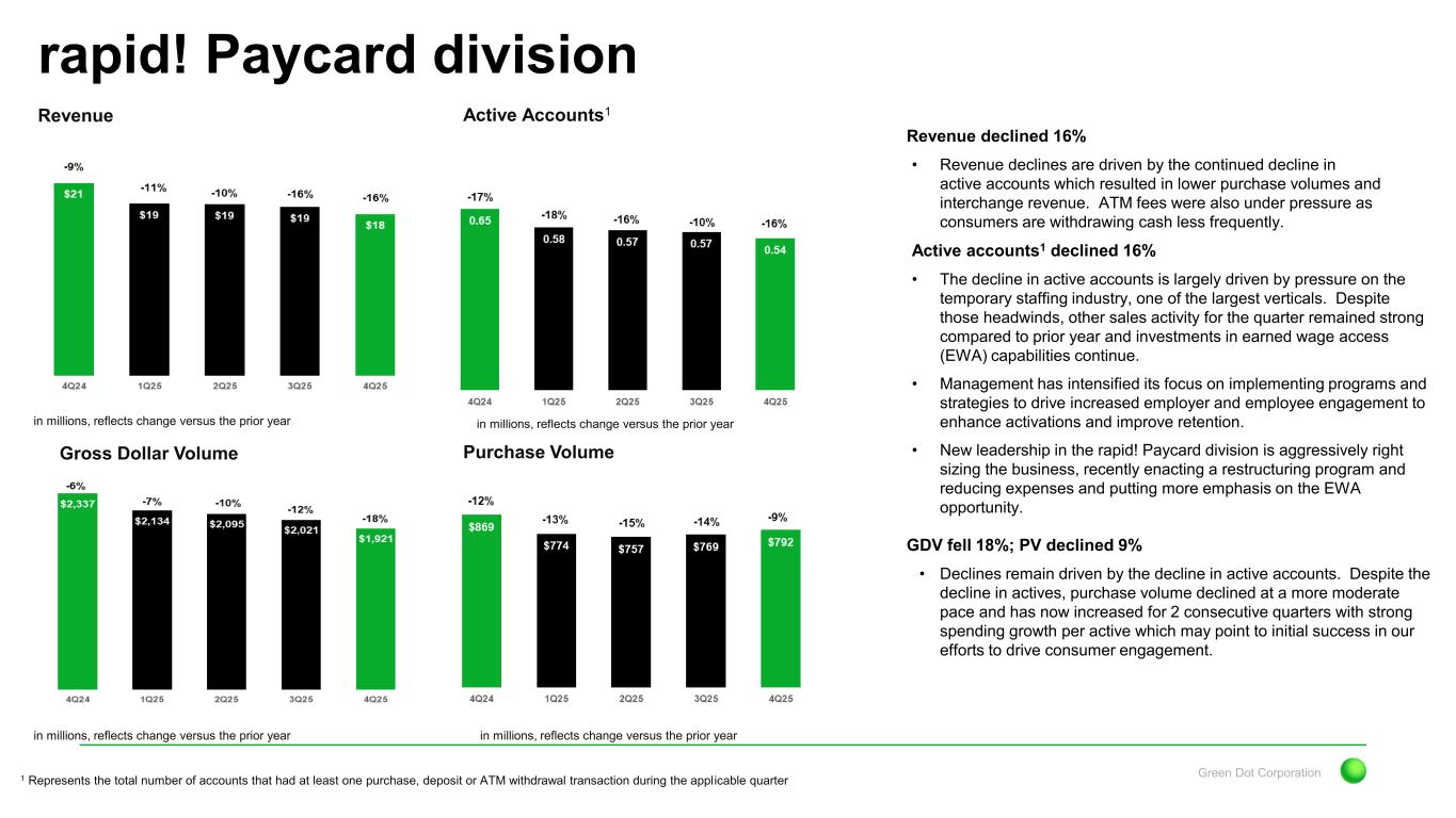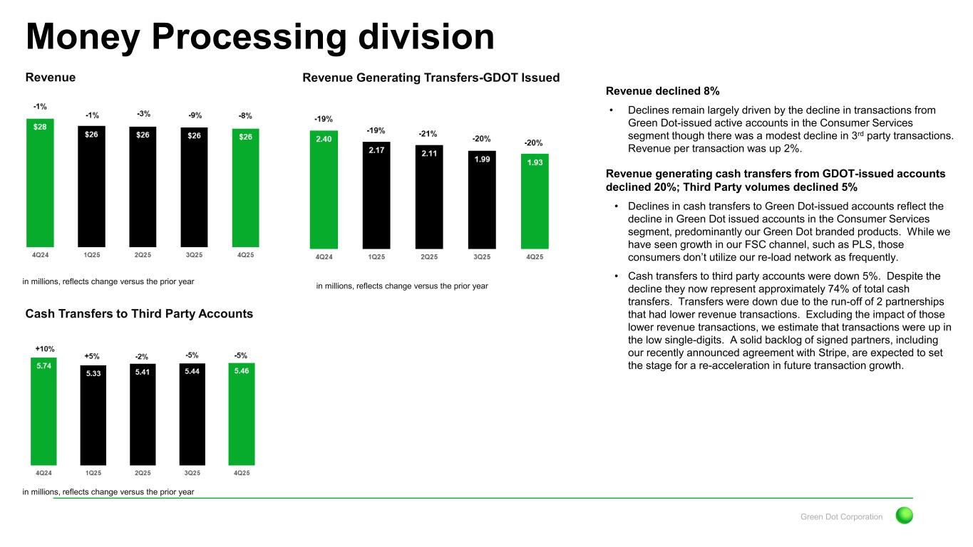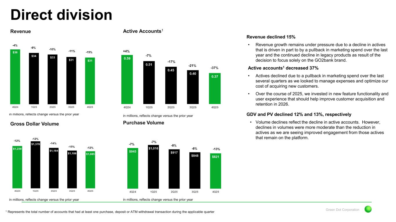 Green Dot Corporation Revenue Direct division Gross Dollar Volume Active Accounts1 Purchase Volume in millions, reflects change versus the prior year in millions, reflects change versus the prior year in millions, reflects change versus the prior year in millions, reflects change versus the prior year Revenue declined 15% • Revenue growth remains under pressure due to a decline in actives that is driven in part to by a pullback in marketing spend over the last year and the continued decline in legacy products as result of the decision to focus solely on the GO2bank brand. Active accounts1 decreased 37% • Actives declined due to a pullback in marketing spend over the last several quarters as we looked to manage expenses and optimize our cost of acquiring new customers. • Over the course of 2025, we invested in new feature functionality and user experience that should help improve customer acquisition and retention in 2026. GDV and PV declined 12% and 13%, respectively • Volume declines reflect the decline in active accounts. However, declines in volumes were more moderate than the reduction in actives as we are seeing improved engagement from those actives that remain on the platform. 1 Represents the total number of accounts that had at least one purchase, deposit or ATM withdrawal transaction during the applicable quarter
