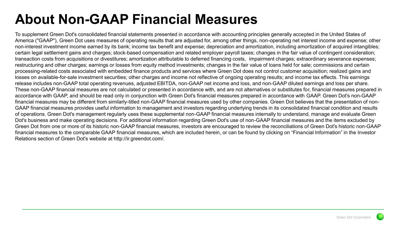Green Dot Corporation About Non-GAAP Financial Measures To supplement Green Dot's consolidated financial statements presented in accordance with accounting principles generally accepted in the United States of America ("GAAP"), Green Dot uses measures of operating results that are adjusted for, among other things, non-operating net interest income and expense; other non-interest investment income earned by its bank; income tax benefit and expense; depreciation and amortization, including amortization of acquired intangibles; certain legal settlement gains and charges; stock-based compensation and related employer payroll taxes; changes in the fair value of contingent consideration; transaction costs from acquisitions or divestitures; amortization attributable to deferred financing costs, impairment charges; extraordinary severance expenses; restructuring and other charges; earnings or losses from equity method investments; changes in the fair value of loans held for sale; commissions and certain processing-related costs associated with embedded finance products and services where Green Dot does not control customer acquisition; realized gains and losses on available-for-sale investment securities; other charges and income not reflective of ongoing operating results; and income tax effects. This earnings release includes non-GAAP total operating revenues, adjusted EBITDA, non-GAAP net income and loss, and non-GAAP diluted earnings and loss per share. These non-GAAP financial measures are not calculated or presented in accordance with, and are not alternatives or substitutes for, financial measures prepared in accordance with GAAP, and should be read only in conjunction with Green Dot's financial measures prepared in accordance with GAAP. Green Dot's non-GAAP financial measures may be different from similarly-titled non-GAAP financial measures used by other companies. Green Dot believes that the presentation of non- GAAP financial measures provides useful information to management and investors regarding underlying trends in its consolidated financial condition and results of operations. Green Dot's management regularly uses these supplemental non-GAAP financial measures internally to understand, manage and evaluate Green Dot's business and make operating decisions. For additional information regarding Green Dot's use of non-GAAP financial measures and the items excluded by Green Dot from one or more of its historic non-GAAP financial measures, investors are encouraged to review the reconciliations of Green Dot's historic non-GAAP financial measures to the comparable GAAP financial measures, which are included herein, or can be found by clicking on “Financial Information” in the Investor Relations section of Green Dot's website at http://ir.greendot.com/.