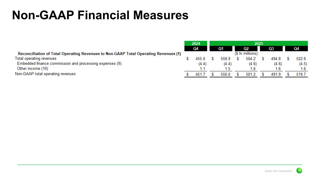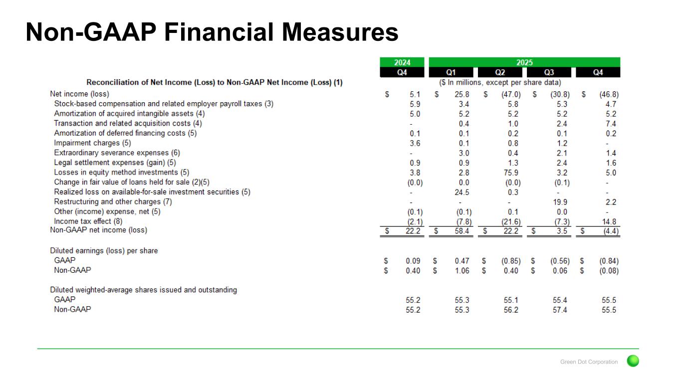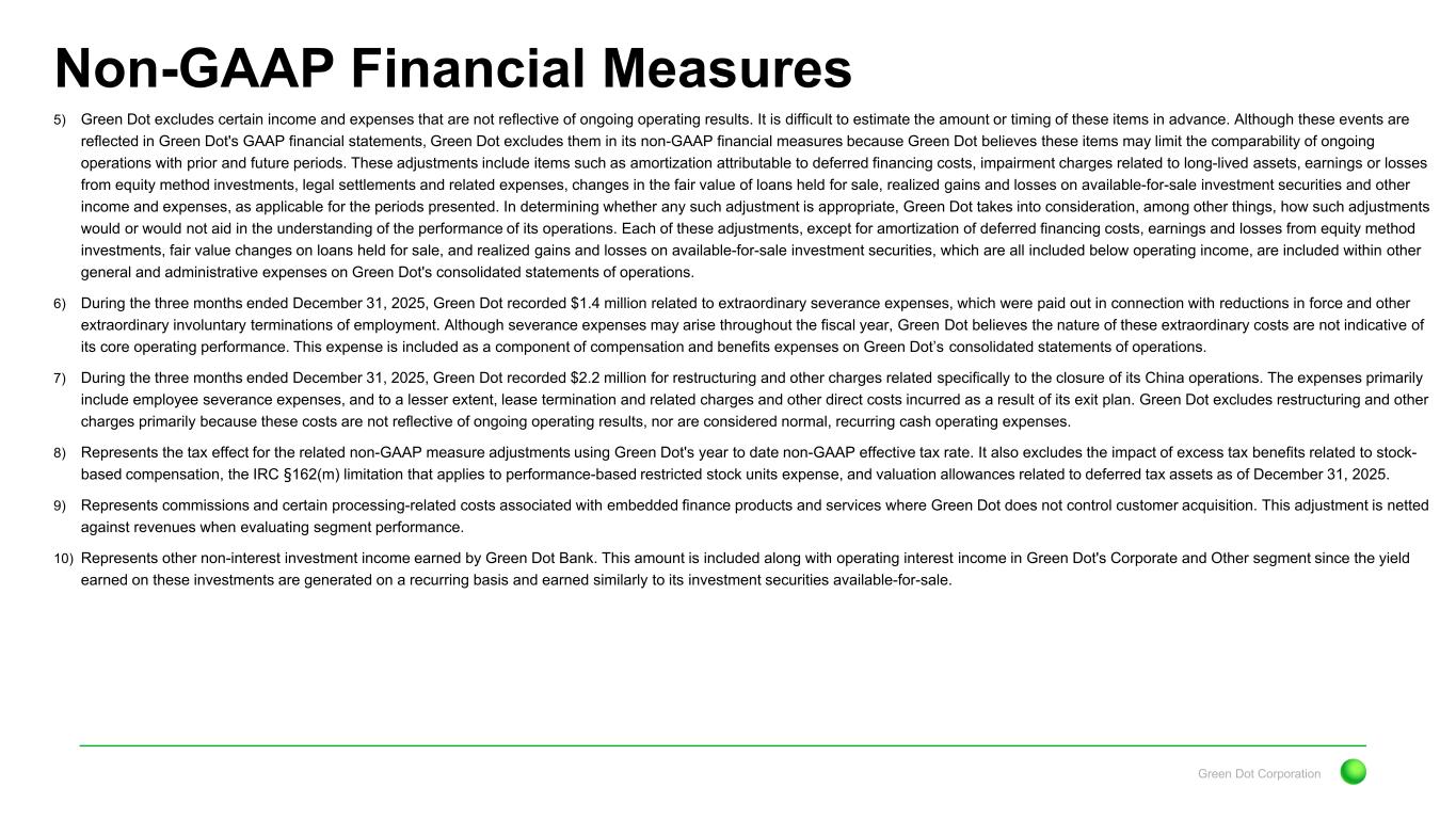 Green Dot Corporation Non-GAAP Financial Measures 5) Green Dot excludes certain income and expenses that are not reflective of ongoing operating results. It is difficult to estimate the amount or timing of these items in advance. Although these events are reflected in Green Dot's GAAP financial statements, Green Dot excludes them in its non-GAAP financial measures because Green Dot believes these items may limit the comparability of ongoing operations with prior and future periods. These adjustments include items such as amortization attributable to deferred financing costs, impairment charges related to long-lived assets, earnings or losses from equity method investments, legal settlements and related expenses, changes in the fair value of loans held for sale, realized gains and losses on available-for-sale investment securities and other income and expenses, as applicable for the periods presented. In determining whether any such adjustment is appropriate, Green Dot takes into consideration, among other things, how such adjustments would or would not aid in the understanding of the performance of its operations. Each of these adjustments, except for amortization of deferred financing costs, earnings and losses from equity method investments, fair value changes on loans held for sale, and realized gains and losses on available-for-sale investment securities, which are all included below operating income, are included within other general and administrative expenses on Green Dot's consolidated statements of operations. 6) During the three months ended December 31, 2025, Green Dot recorded $1.4 million related to extraordinary severance expenses, which were paid out in connection with reductions in force and other extraordinary involuntary terminations of employment. Although severance expenses may arise throughout the fiscal year, Green Dot believes the nature of these extraordinary costs are not indicative of its core operating performance. This expense is included as a component of compensation and benefits expenses on Green Dot’s consolidated statements of operations. 7) During the three months ended December 31, 2025, Green Dot recorded $2.2 million for restructuring and other charges related specifically to the closure of its China operations. The expenses primarily include employee severance expenses, and to a lesser extent, lease termination and related charges and other direct costs incurred as a result of its exit plan. Green Dot excludes restructuring and other charges primarily because these costs are not reflective of ongoing operating results, nor are considered normal, recurring cash operating expenses. 8) Represents the tax effect for the related non-GAAP measure adjustments using Green Dot's year to date non-GAAP effective tax rate. It also excludes the impact of excess tax benefits related to stock- based compensation, the IRC §162(m) limitation that applies to performance-based restricted stock units expense, and valuation allowances related to deferred tax assets as of December 31, 2025. 9) Represents commissions and certain processing-related costs associated with embedded finance products and services where Green Dot does not control customer acquisition. This adjustment is netted against revenues when evaluating segment performance. 10) Represents other non-interest investment income earned by Green Dot Bank. This amount is included along with operating interest income in Green Dot's Corporate and Other segment since the yield earned on these investments are generated on a recurring basis and earned similarly to its investment securities available-for-sale.
