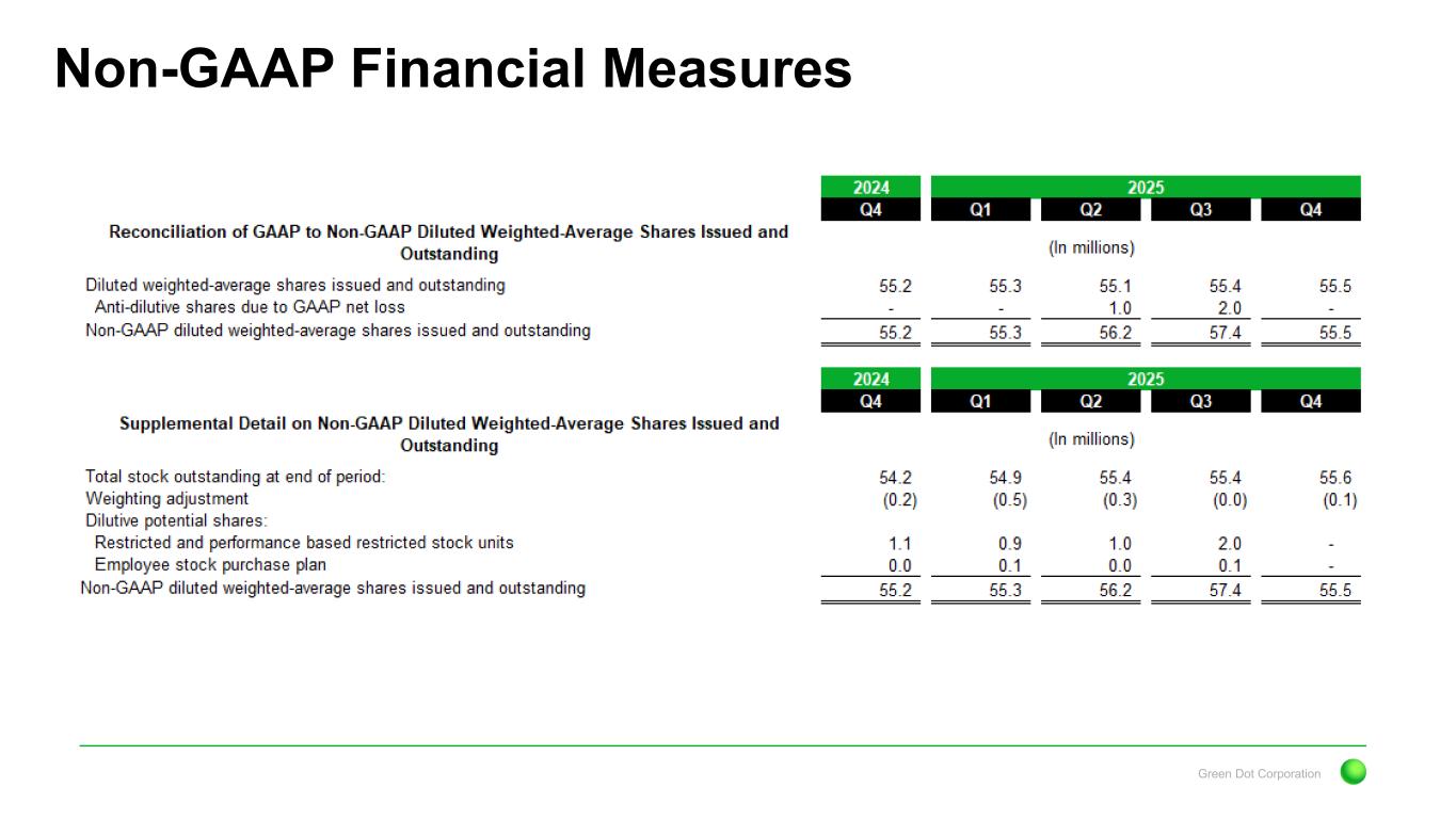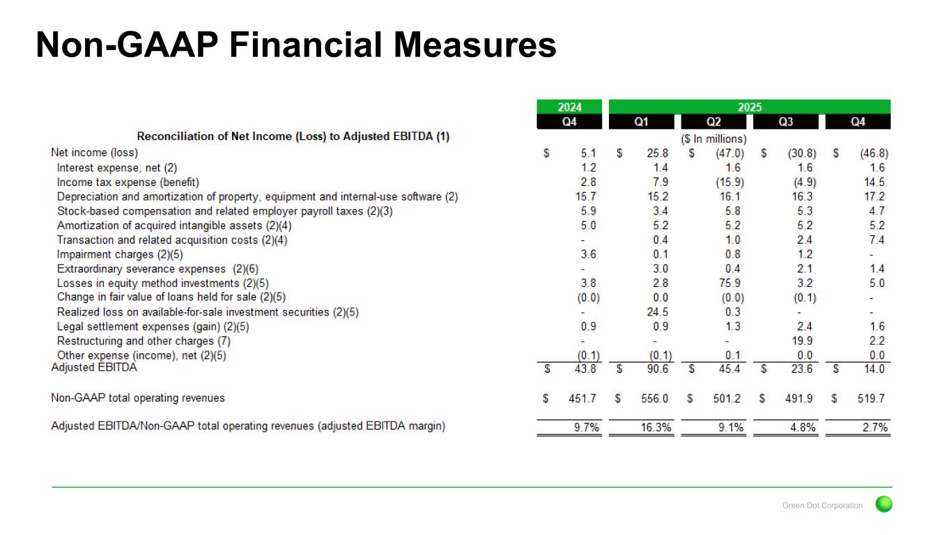 Green Dot Corporation Non-GAAP Financial Measures 1) To supplement Green Dot’s consolidated financial statements presented in accordance with GAAP, Green Dot uses measures of operating results that are adjusted to exclude various, primarily non-cash, expenses and charges. These financial measures are not calculated or presented in accordance with GAAP and should not be considered as alternatives to or substitutes for operating revenues, operating income, net income or any other measure of financial performance calculated and presented in accordance with GAAP. These financial measures may not be comparable to similarly-titled measures of other organizations because other organizations may not calculate their measures in the same manner as Green Dot does. These financial measures are adjusted to eliminate the impact of items that Green Dot does not consider indicative of its core operating performance. You are encouraged to evaluate these adjustments and the reasons Green Dot considers them appropriate. Green Dot believes that the non-GAAP financial measures it presents are useful to investors in evaluating Green Dot’s operating performance for the following reasons: • adjusted EBITDA is widely used by investors to measure a company’s operating performance without regard to items, such as non-operating net interest income and expense, income tax benefit and expense, depreciation and amortization, stock-based compensation and related employer payroll taxes, changes in the fair value of contingent consideration, transaction costs, impairment charges, extraordinary severance expenses, certain legal settlement and related expenses, earnings or losses from equity method investments, changes in the fair value of loans held for sale, realized gains and losses on available-for-sale investment securities, and other charges and income that can vary substantially from company to company depending upon their respective financing structures and accounting policies, the book values of their assets, their capital structures and the methods by which their assets were acquired; • securities analysts use adjusted EBITDA as a supplemental measure to evaluate the overall operating performance of companies; and • Green Dot records stock-based compensation from period to period, and recorded stock-based compensation expenses and related employer payroll taxes, net of forfeitures, of approximately $4.7 million and $5.9 million for the three months ended December 31, 2025 and 2024, respectively. By comparing Green Dot’s adjusted EBITDA, non-GAAP net income and non-GAAP diluted earnings per share in different historical periods, investors can evaluate Green Dot’s operating results without the additional variations caused by stock-based compensation expense and related employer payroll taxes, which may not be comparable from period to period due to changes in the fair market value of Green Dot’s Class A common stock (which is influenced by external factors like the volatility of the public markets and the financial performance of Green Dot’s peers) and is not a key measure of Green Dot’s operations. Green Dot’s management uses the non-GAAP financial measures: • as measures of operating performance, because they exclude the impact of items not directly resulting from Green Dot’s core operations; • for planning purposes, including the preparation of Green Dot’s annual operating budget; • to allocate resources to enhance the financial performance of Green Dot’s business; • to evaluate the effectiveness of Green Dot’s business strategies; • to establish metrics for variable compensation; and • in communications with Green Dot’s board of directors concerning Green Dot’s financial performance.