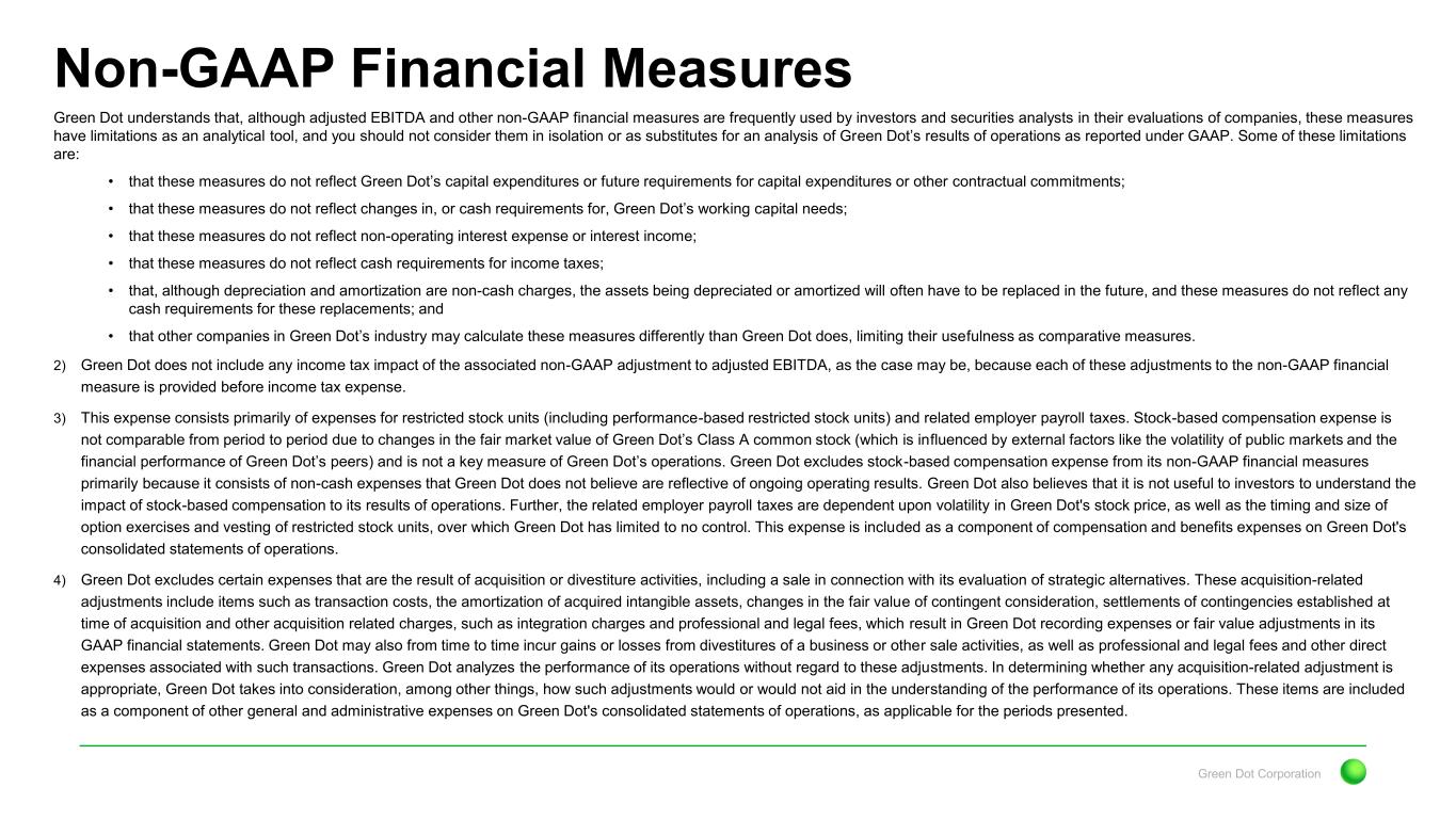 Green Dot Corporation Non-GAAP Financial Measures Green Dot understands that, although adjusted EBITDA and other non-GAAP financial measures are frequently used by investors and securities analysts in their evaluations of companies, these measures have limitations as an analytical tool, and you should not consider them in isolation or as substitutes for an analysis of Green Dot’s results of operations as reported under GAAP. Some of these limitations are: • that these measures do not reflect Green Dot’s capital expenditures or future requirements for capital expenditures or other contractual commitments; • that these measures do not reflect changes in, or cash requirements for, Green Dot’s working capital needs; • that these measures do not reflect non-operating interest expense or interest income; • that these measures do not reflect cash requirements for income taxes; • that, although depreciation and amortization are non-cash charges, the assets being depreciated or amortized will often have to be replaced in the future, and these measures do not reflect any cash requirements for these replacements; and • that other companies in Green Dot’s industry may calculate these measures differently than Green Dot does, limiting their usefulness as comparative measures. 2) Green Dot does not include any income tax impact of the associated non-GAAP adjustment to adjusted EBITDA, as the case may be, because each of these adjustments to the non-GAAP financial measure is provided before income tax expense. 3) This expense consists primarily of expenses for restricted stock units (including performance-based restricted stock units) and related employer payroll taxes. Stock-based compensation expense is not comparable from period to period due to changes in the fair market value of Green Dot’s Class A common stock (which is influenced by external factors like the volatility of public markets and the financial performance of Green Dot’s peers) and is not a key measure of Green Dot’s operations. Green Dot excludes stock-based compensation expense from its non-GAAP financial measures primarily because it consists of non-cash expenses that Green Dot does not believe are reflective of ongoing operating results. Green Dot also believes that it is not useful to investors to understand the impact of stock-based compensation to its results of operations. Further, the related employer payroll taxes are dependent upon volatility in Green Dot's stock price, as well as the timing and size of option exercises and vesting of restricted stock units, over which Green Dot has limited to no control. This expense is included as a component of compensation and benefits expenses on Green Dot's consolidated statements of operations. 4) Green Dot excludes certain expenses that are the result of acquisition or divestiture activities, including a sale in connection with its evaluation of strategic alternatives. These acquisition-related adjustments include items such as transaction costs, the amortization of acquired intangible assets, changes in the fair value of contingent consideration, settlements of contingencies established at time of acquisition and other acquisition related charges, such as integration charges and professional and legal fees, which result in Green Dot recording expenses or fair value adjustments in its GAAP financial statements. Green Dot may also from time to time incur gains or losses from divestitures of a business or other sale activities, as well as professional and legal fees and other direct expenses associated with such transactions. Green Dot analyzes the performance of its operations without regard to these adjustments. In determining whether any acquisition-related adjustment is appropriate, Green Dot takes into consideration, among other things, how such adjustments would or would not aid in the understanding of the performance of its operations. These items are included as a component of other general and administrative expenses on Green Dot's consolidated statements of operations, as applicable for the periods presented.
